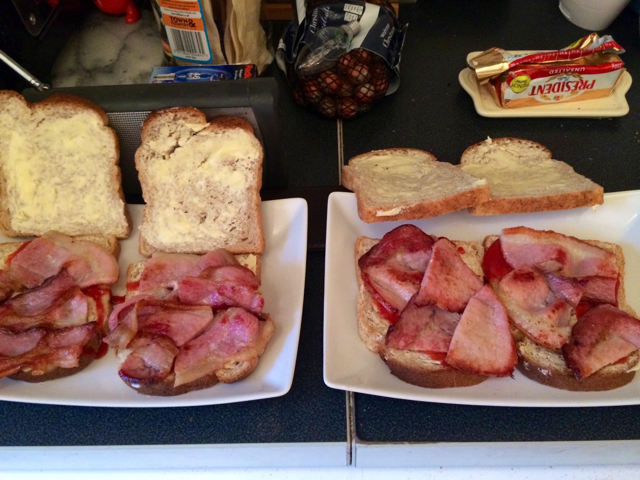 Brown hovis bread.. French butter and red sauce..