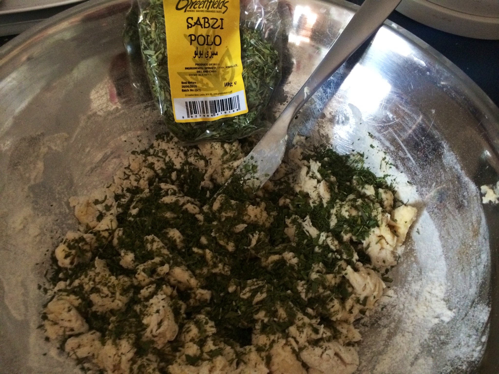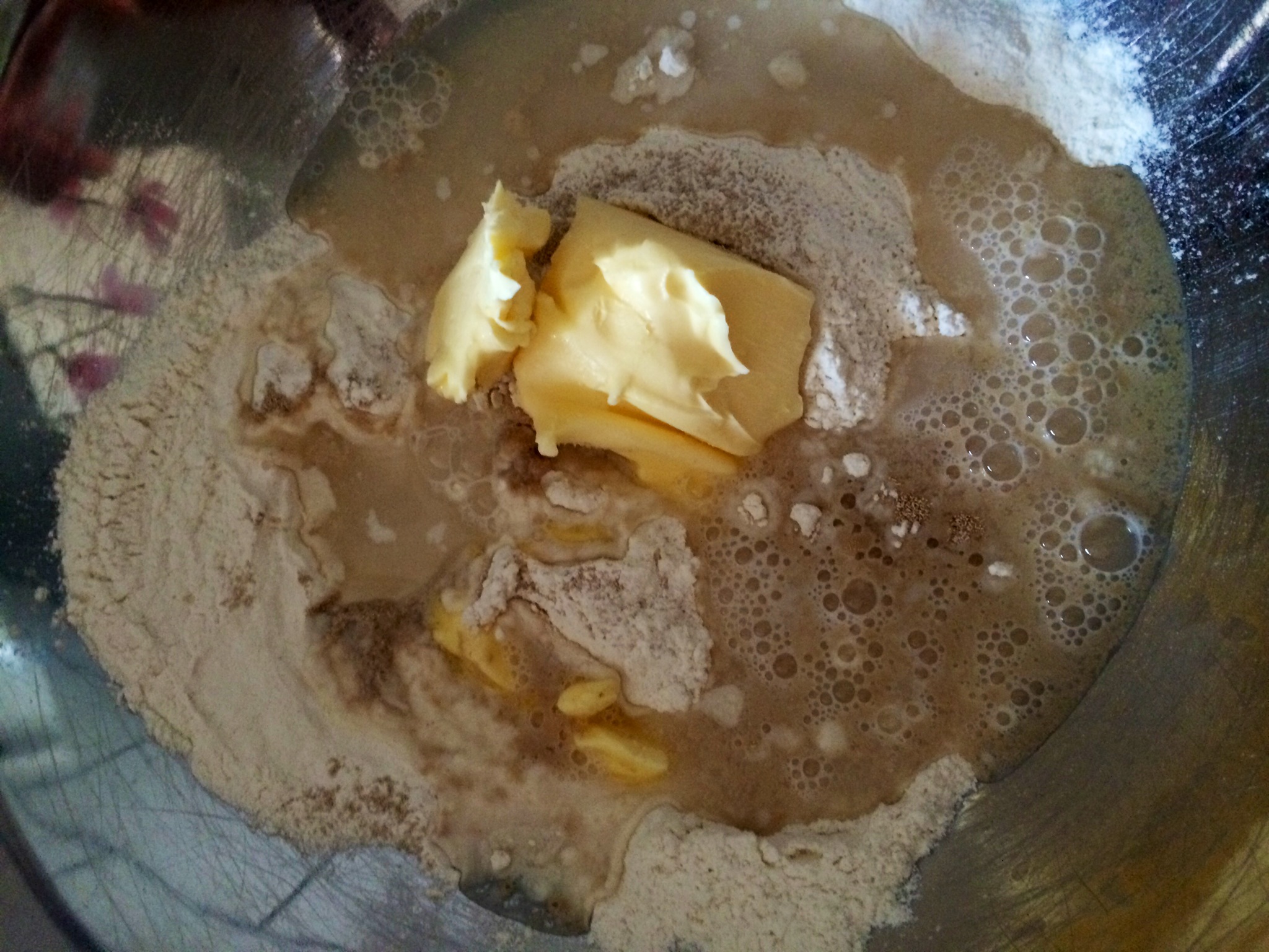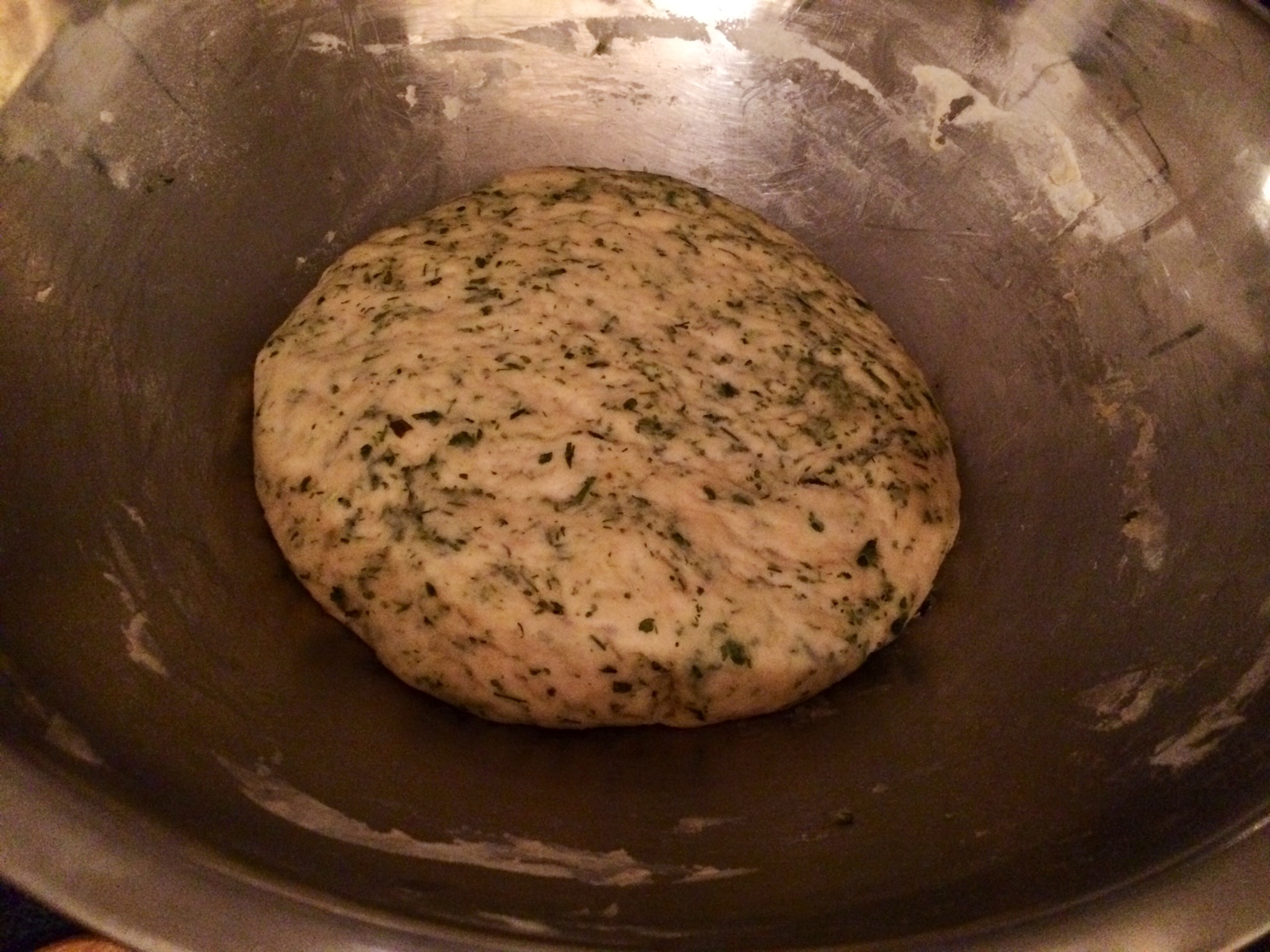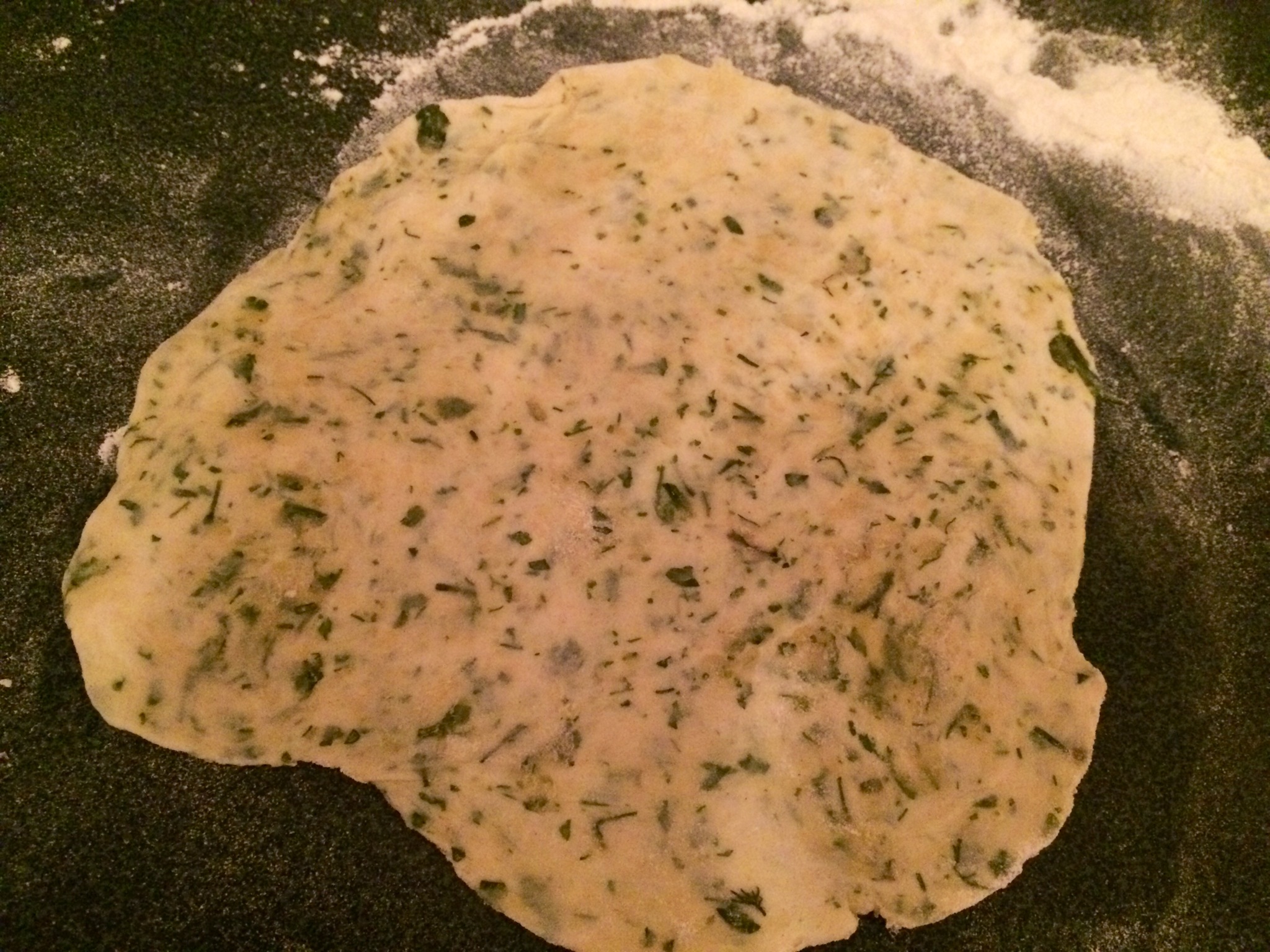 Flour , yeast, salt and xylitol.. French butter and sabzi pollo Lebanese herbs..