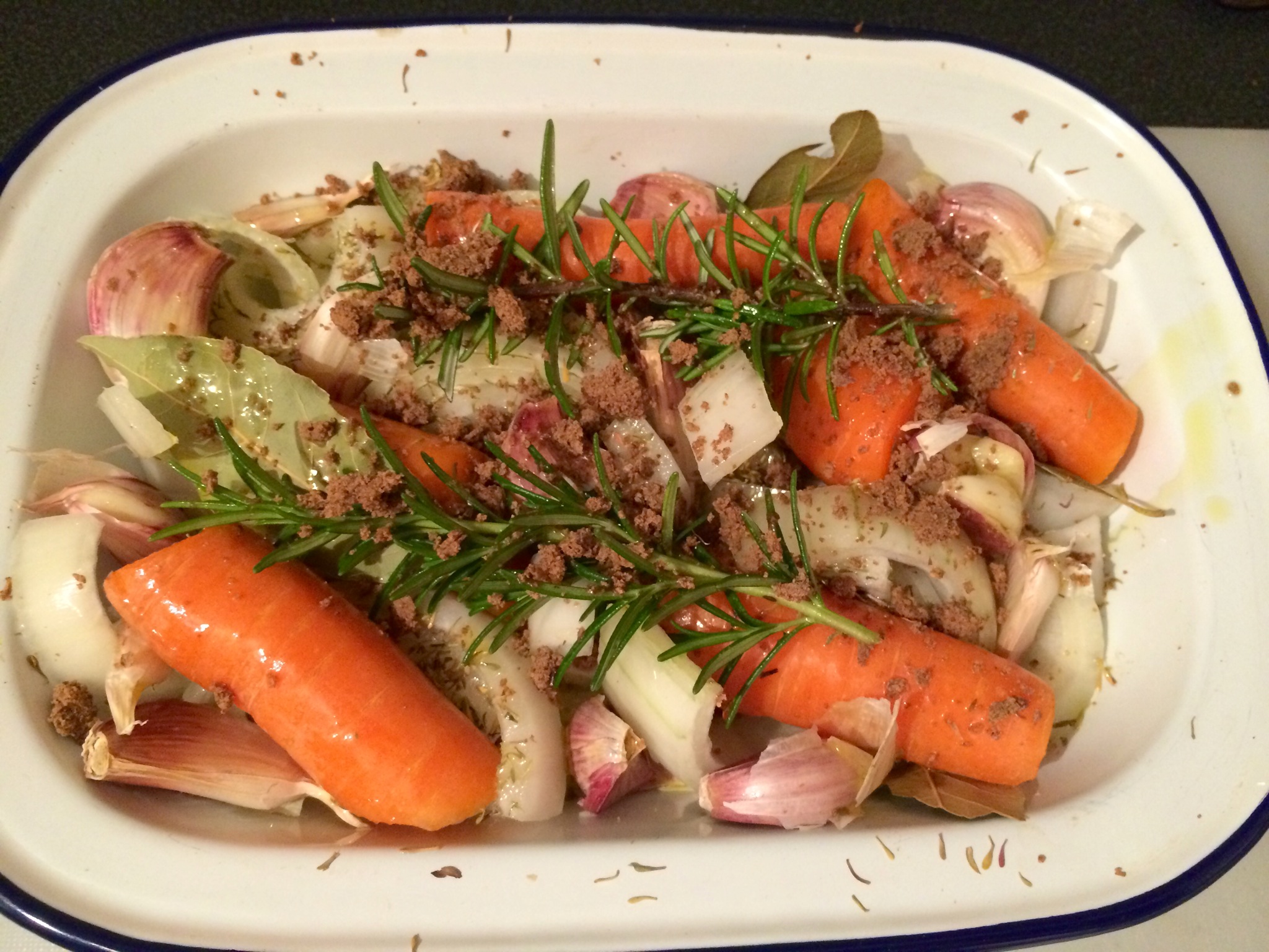 Onion, carrot , garlic and herbs into the small enamel pan.. Beef on top.. All seasoned and olive oil splashed on.. That really is it!!