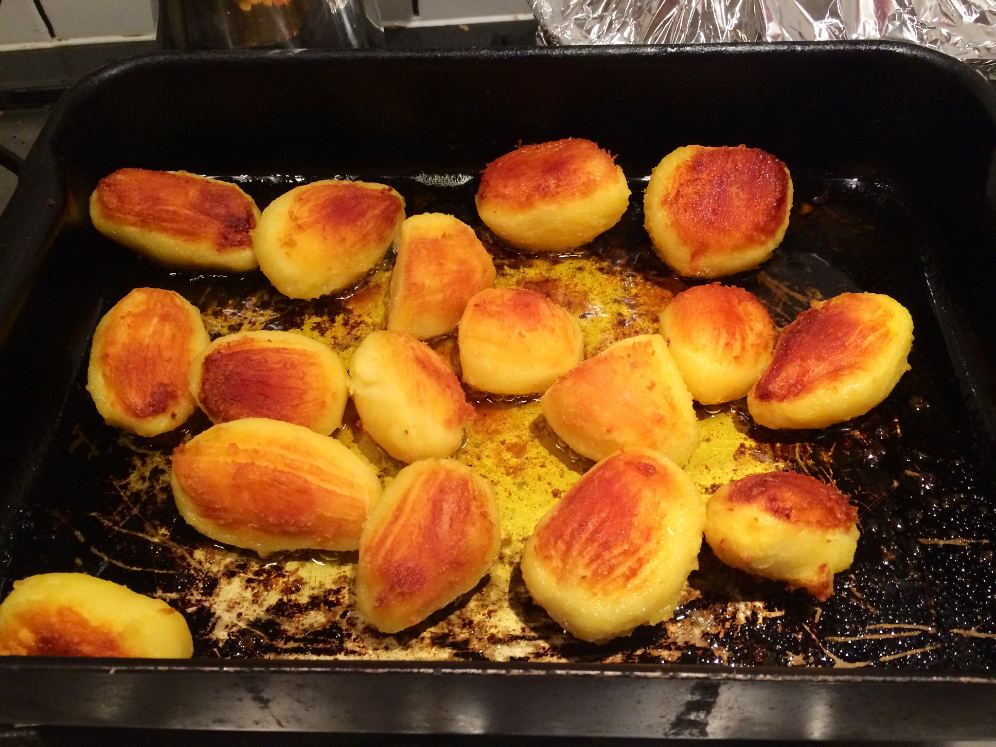 Simply boiled for 8 minutes.. Shook about in the colander.. Into oil.. Into the oven..