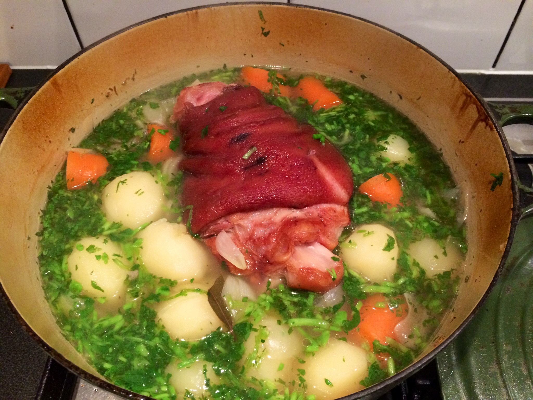 Smoked ham hock, with carrots , some of my old pal Jack Taylor’s spuds .. (I think he will be happy looking down from the heavens at this cracking dish..).. Onions and watercress stalks.. Bristol blend pepper as the only seasoning.. And a splosh of milk..