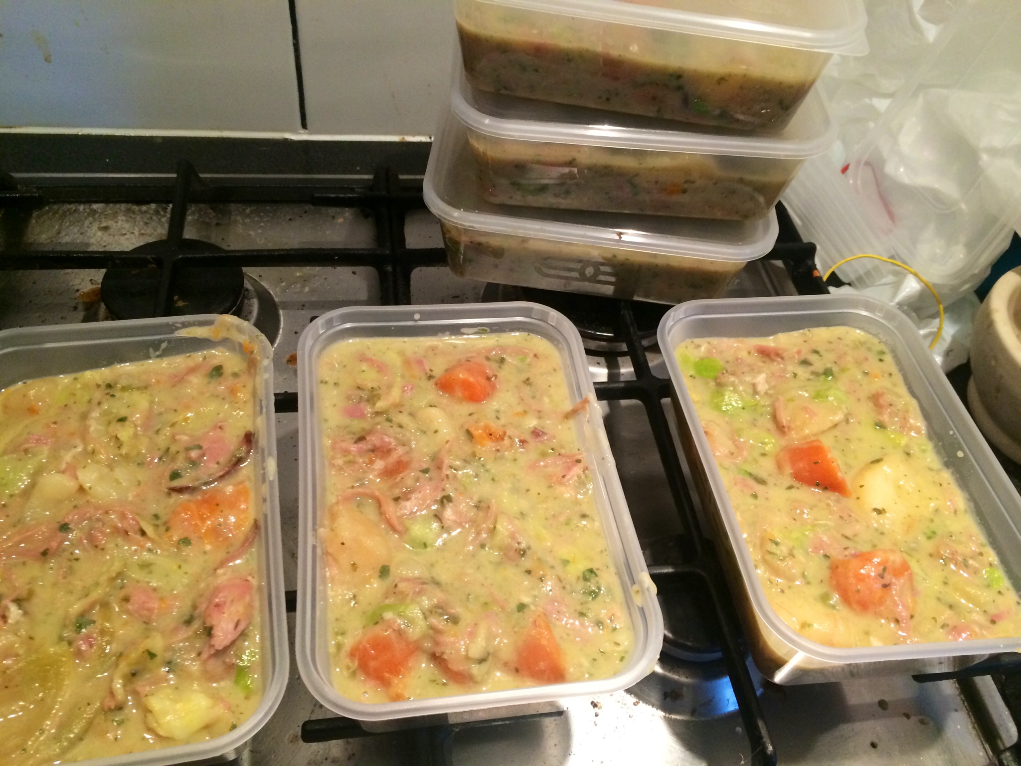 When reduced a little.. It thickens with some of the broken spuds.. Carton it up ready for the gifts