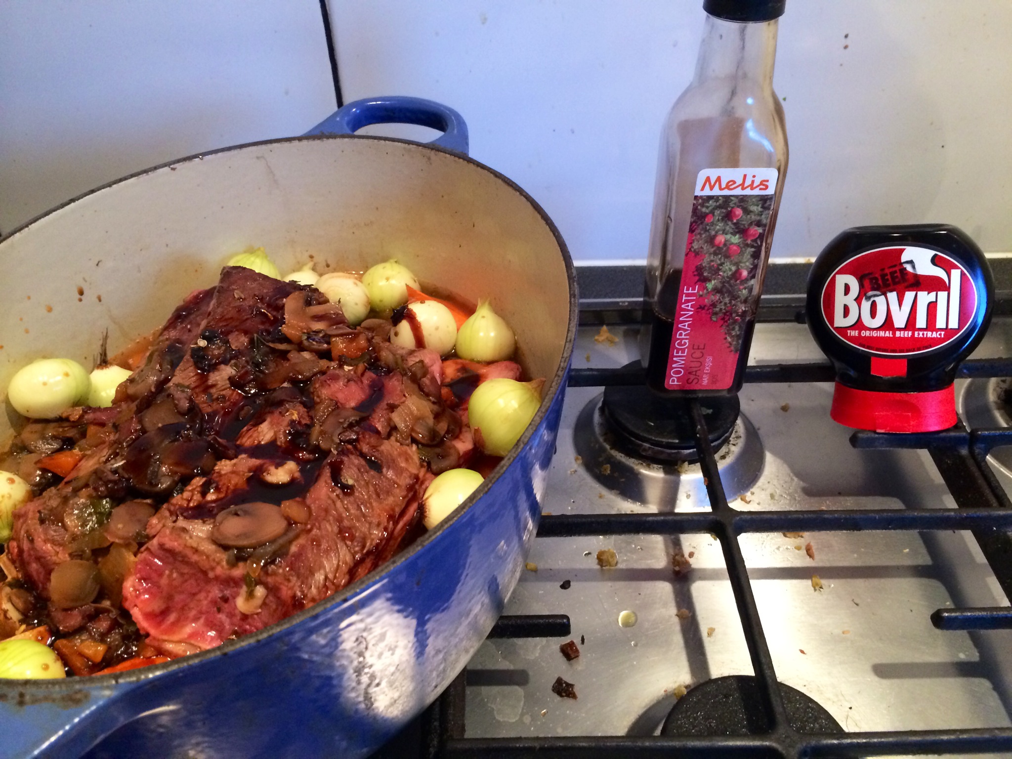Once all in the pot.. The addition of pomegranate sauce and a good squidge of bovril..