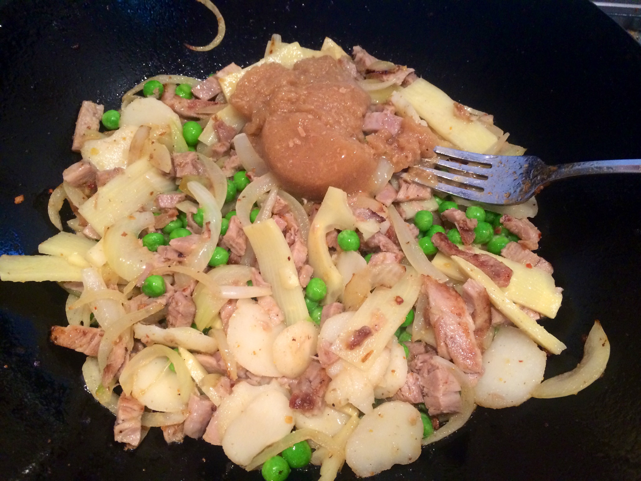 Then all in the wok.. Some frozen peas too, a sprinkle of seasonings, dark soy , a drip drip of sesame oil..