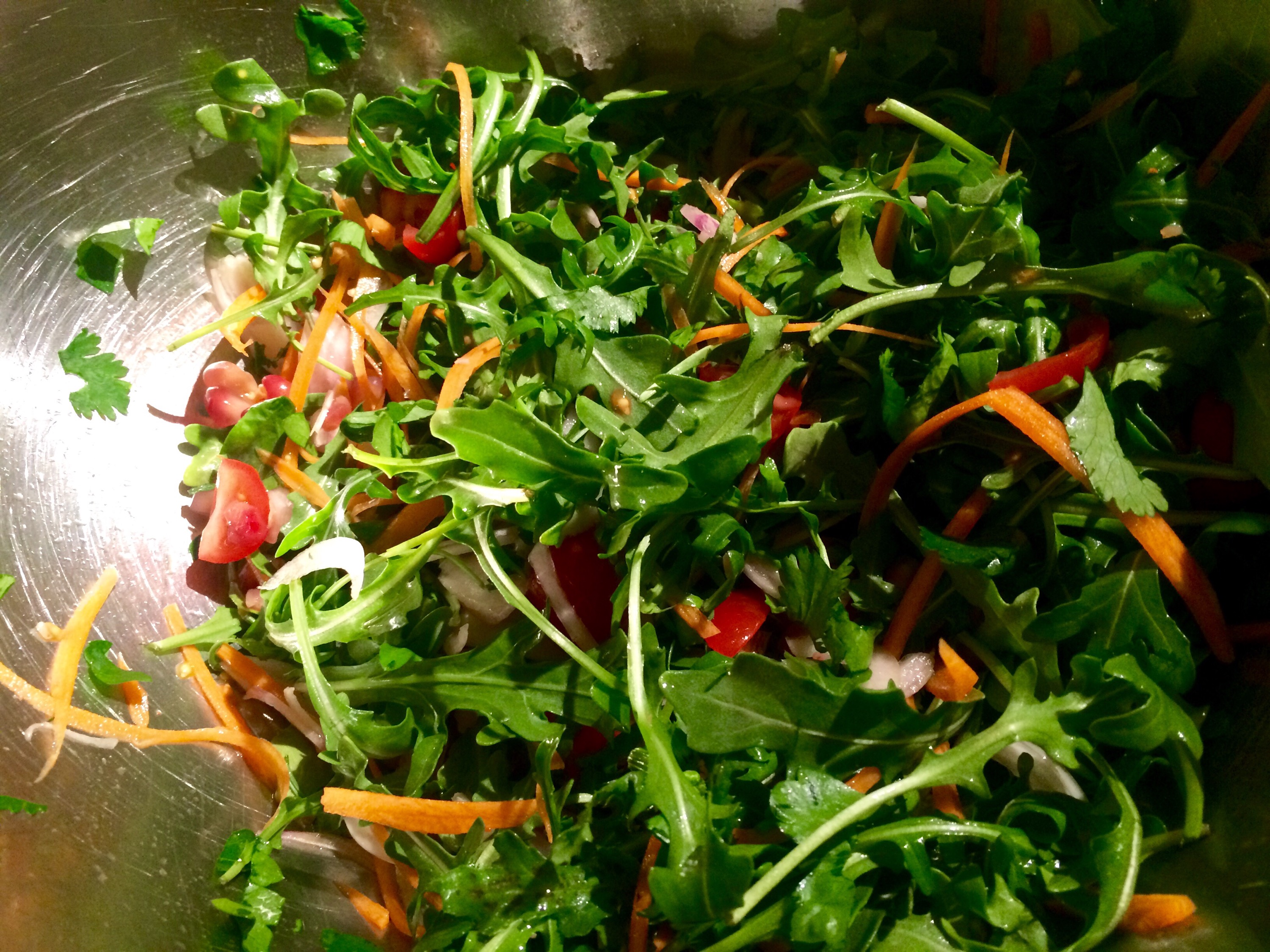 Of carrots, wild rocket, pink Indian onions, Italian baby vine toms..( delicious them!)..