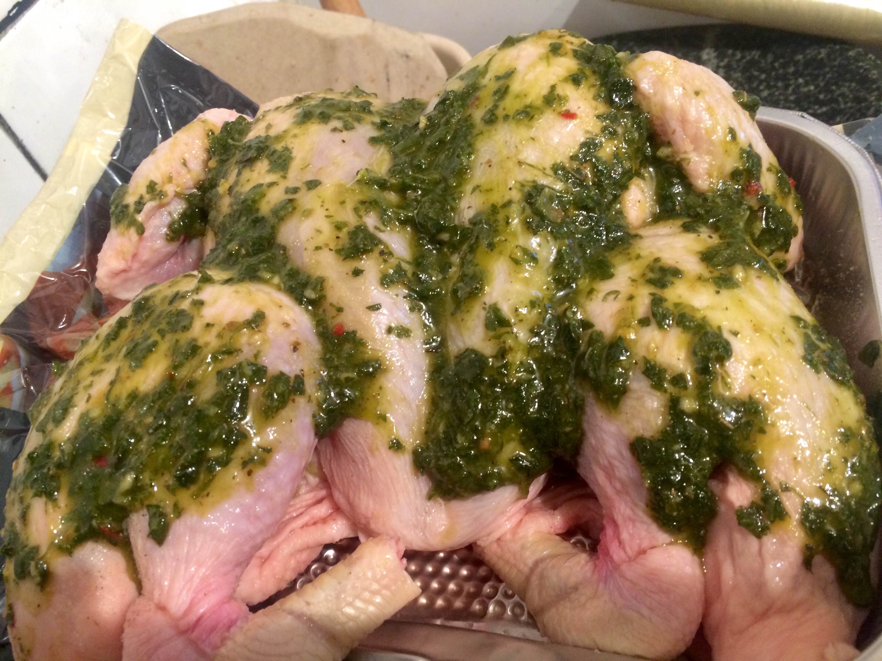 Not going to roast it in its bag.. Am cutting out the backbone.. If you don’t have a pair of poultry scissors then garden snips will do.. Clean them first I suppose? And also snip what’s left of the feet and the wing tips..
