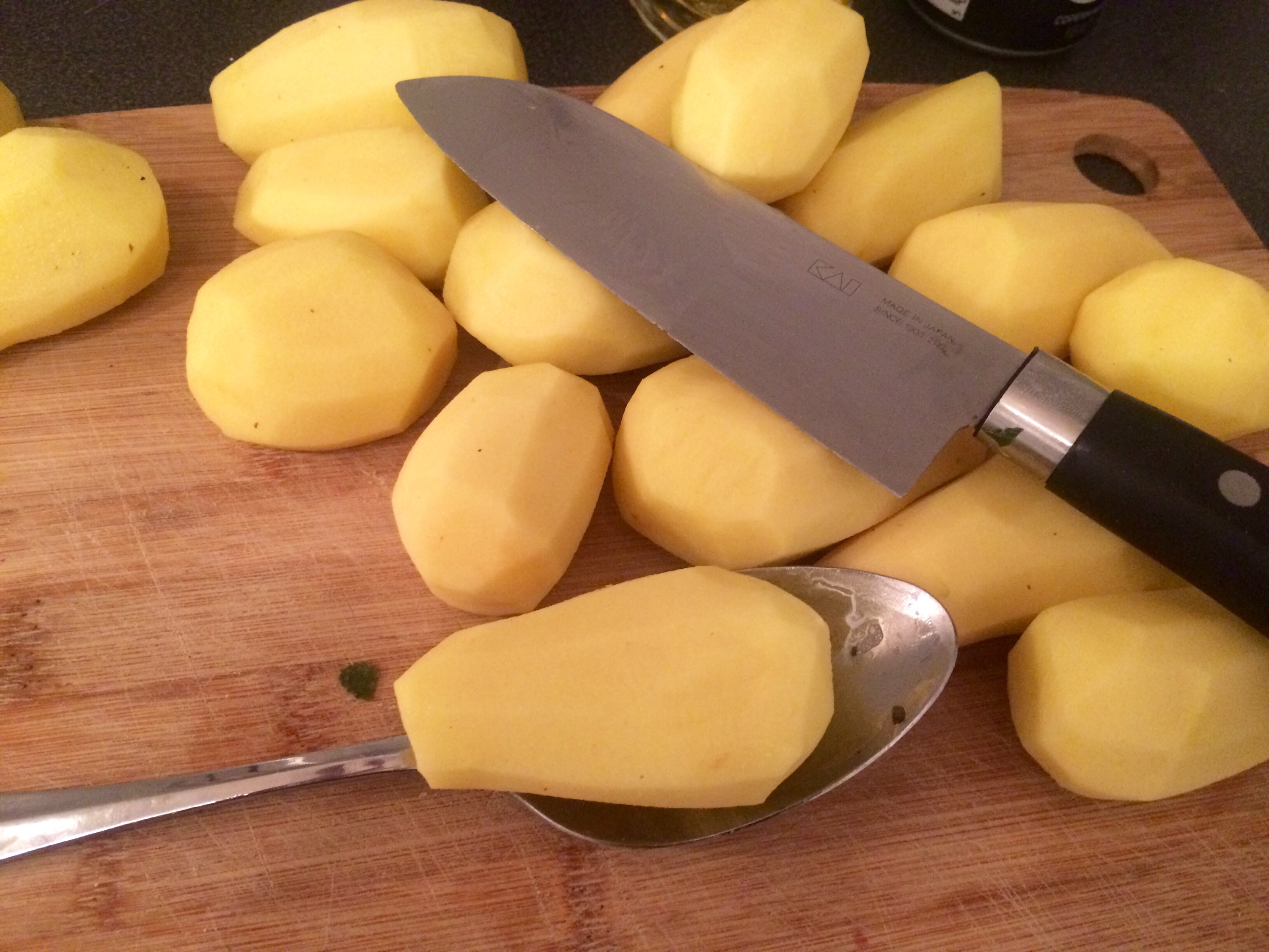 The spuds are simply peeled and cut with a knife.. I have used a metal spoon which is not ideal to protect your knife! Wooden or on chopsticks really is better.. Anything really just to make sure you don’t cut all the way through them.