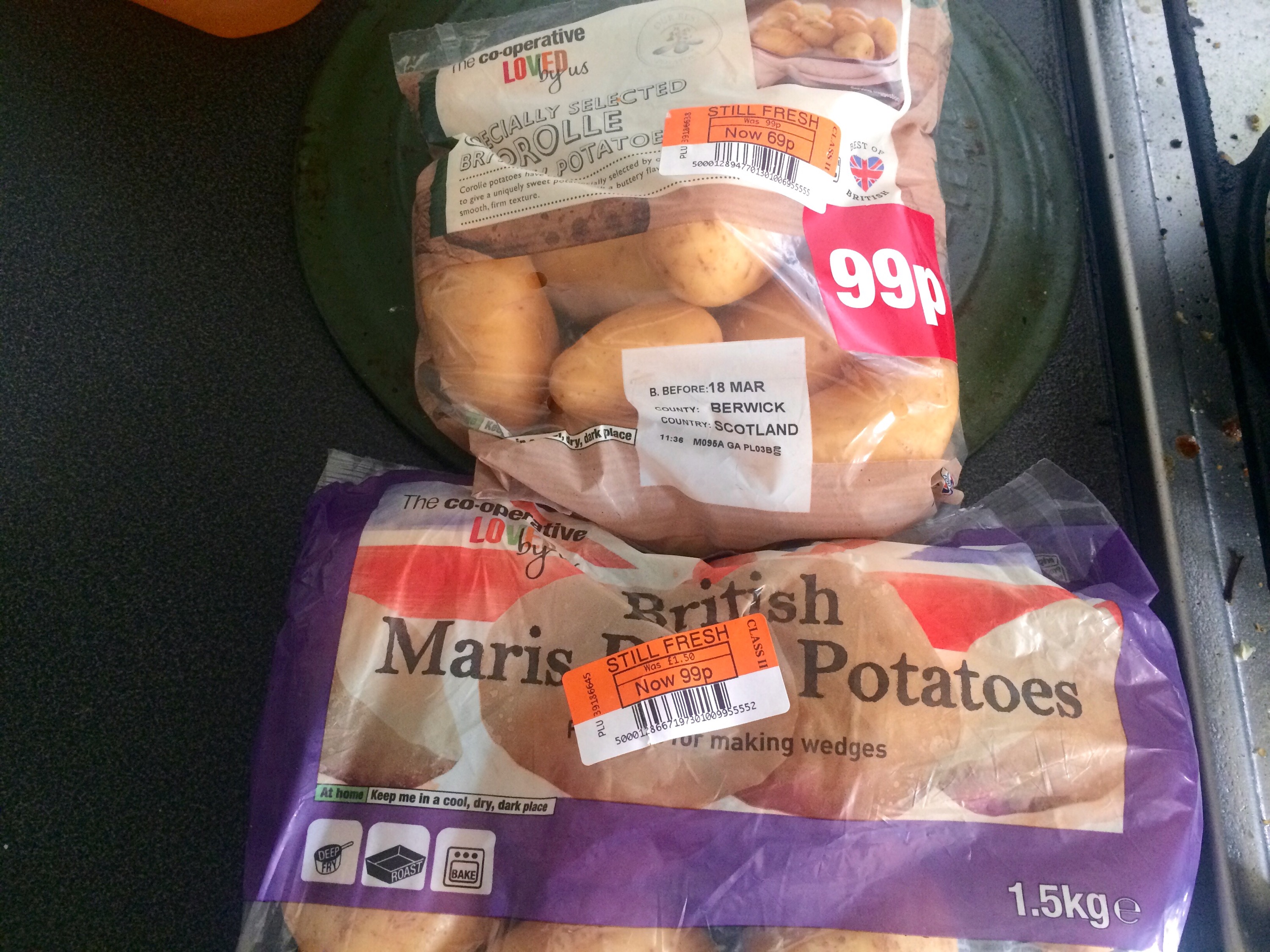 Now to make this extra it needs two types of reduced sticker potatoes.. One Maris piper for flouriness and another scottish waxy one in peeled.. You need both spuds it makes z big difference in eating..