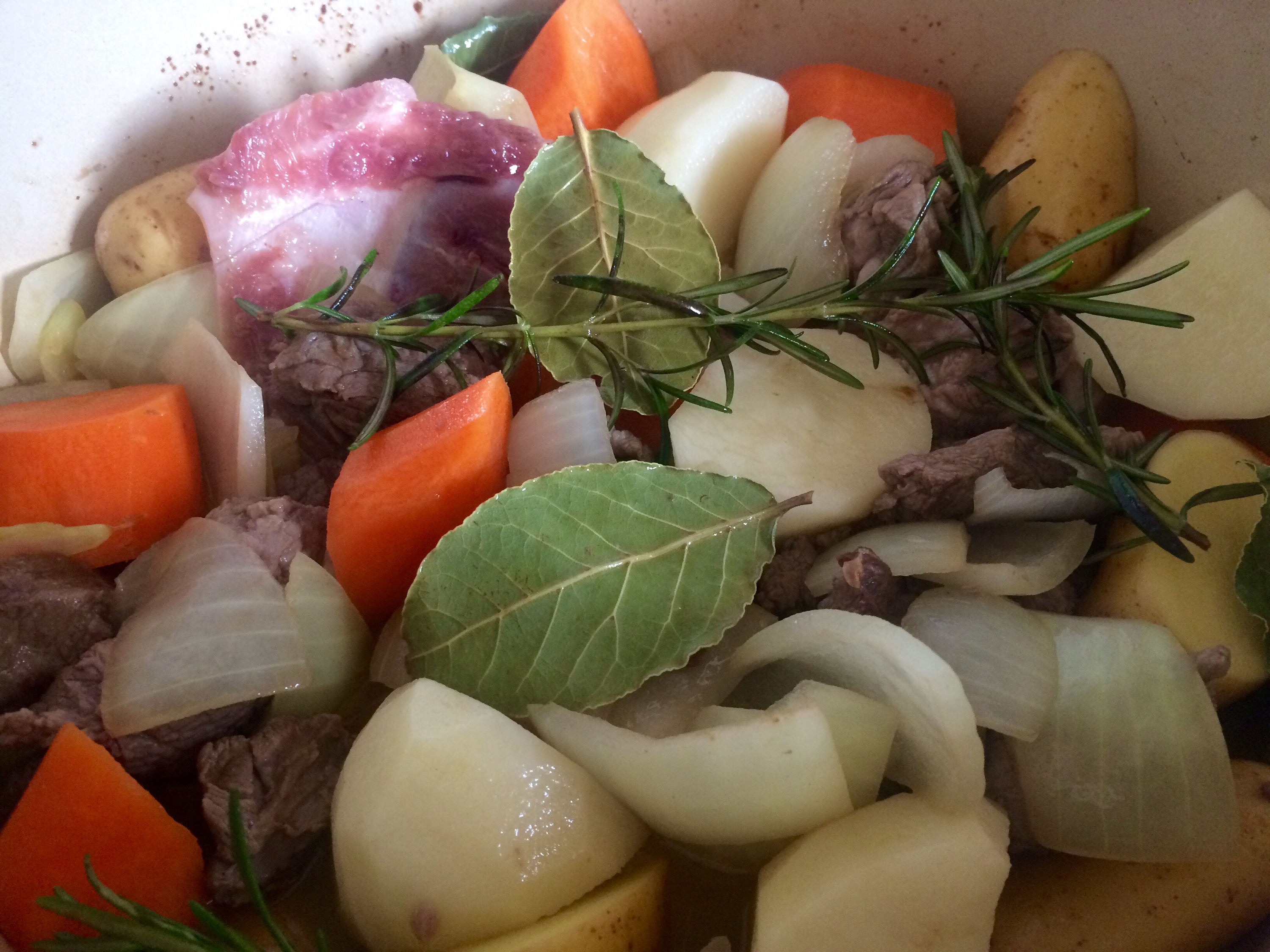 And then simplicity is key.. That meat will do all the work.. The flat bone is in there too . Onions and carrots, bay from my grandfathers garden and Rosemary from ours.. Topped up with a little lamb stock just to rock the party..