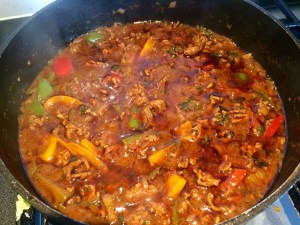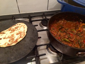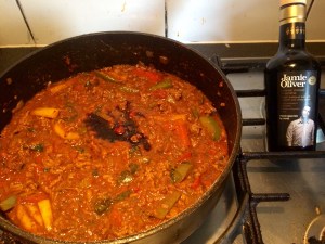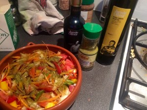 Cooked up with red yellow and green peppers, onions , garlic, rose Harissa, (lovely that).. And lamb shawarma spices.. Oh and a can of Italian plum toms.. Don’t bother buying the chopped ones.. The tomatoe to water ratio just isn’t right in my book!