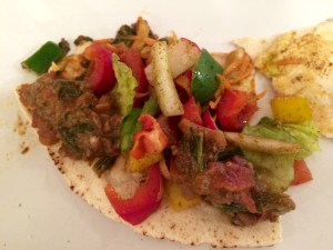 With a salad that had been seasoned with arabic salad seasonings.. Radishes, peppers, romaine lettuce, scallions and white onions.. Toms too.. Olive oil and a splash of a wine vinegar that I can’t remember ..