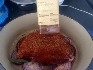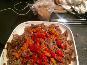 Adding the end of a tub of roasted peppers , the onions from the pan.. all the juices amd some smuggled Irish seasoning.. (Although anything will do.. BBQ sauce, soy, anything!)..