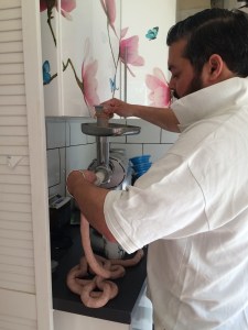 The skins are real pig.. Hand harvested by my butchers pal.. They are good indeed.. Keep them in salt if you don’t plan on using them all straight away.. Lamb ones make for great smaller sausages.. And have that pleasing ‘snap!,.. Collagen ones I find are really too much hassle.. Great as they store ambient yet not very nice in a regular banger.. Once threaded into the nozzle.. Feed the meat through..