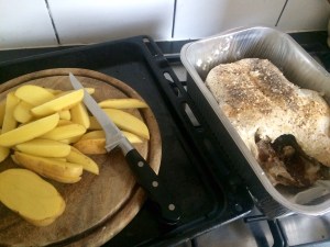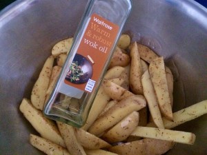 The chips? Anointed with wok oil and a shakey shake of herbs and cooked in the oven. It’s on for the duck so why not make this a super easy supper?