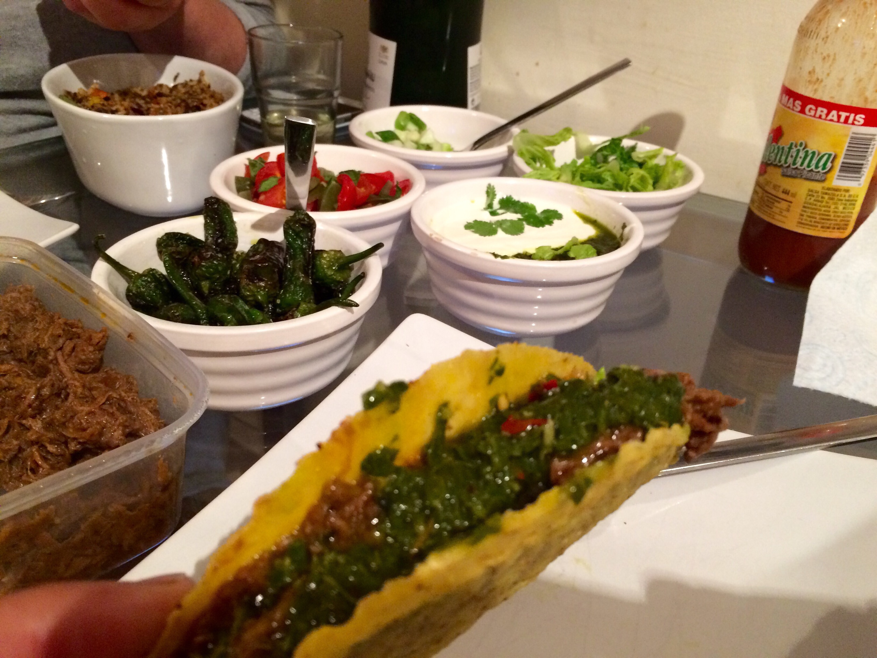 With a full compliment of toms with jalapeños and garden coriander , sour cream. Chimichurri of course! Cucumber.. Spring onions and other bits.. Other bits?