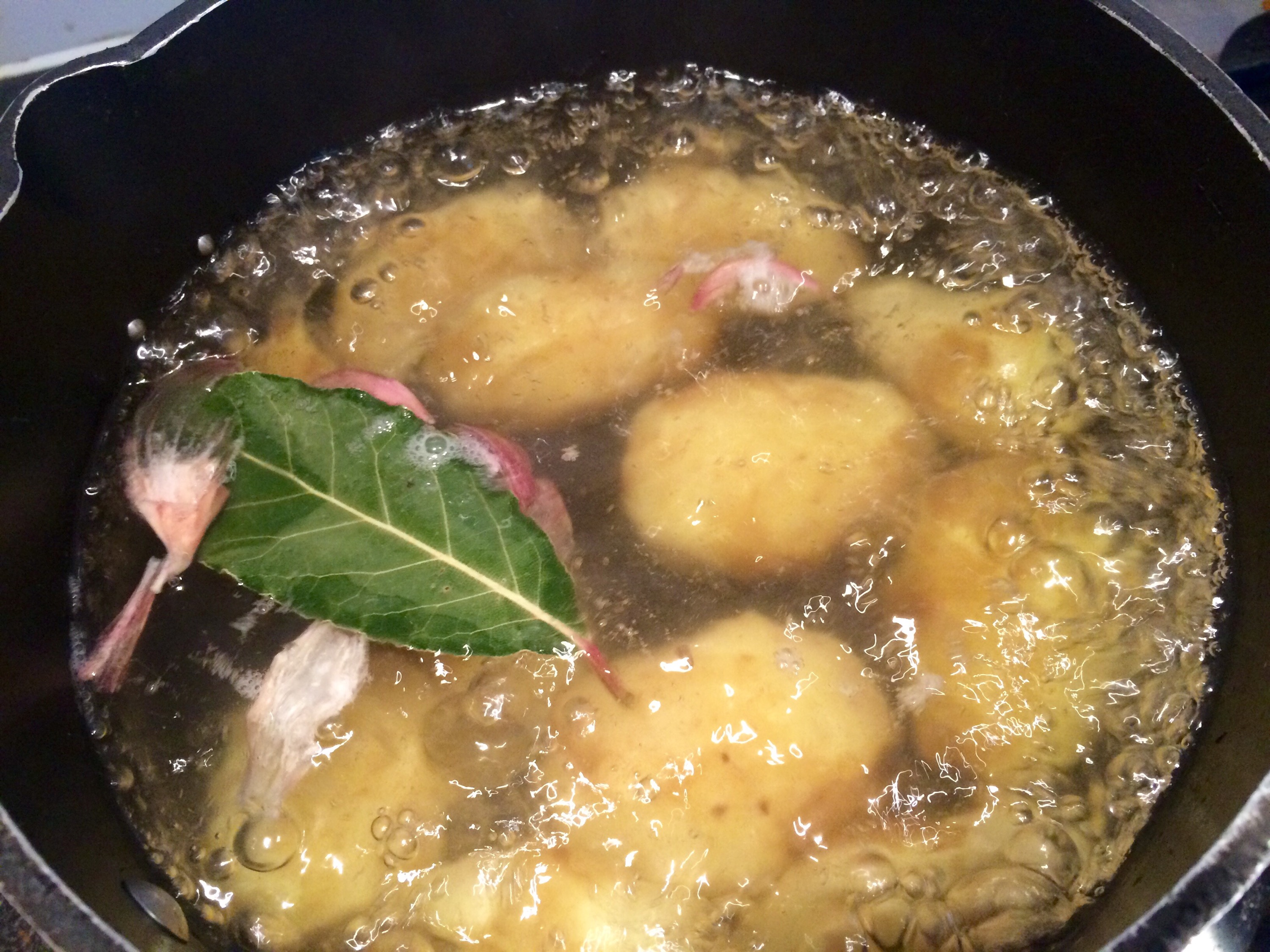 Washing the dirt offa the Jersey royals then into a pan of reverse osmosis water (yeah really!).. Some French grey salt, a bay leaf from my grandfathers garden and some of the outer papery leaves/skin from the Patagonian purple garlic..