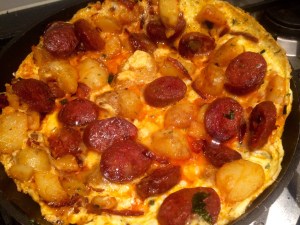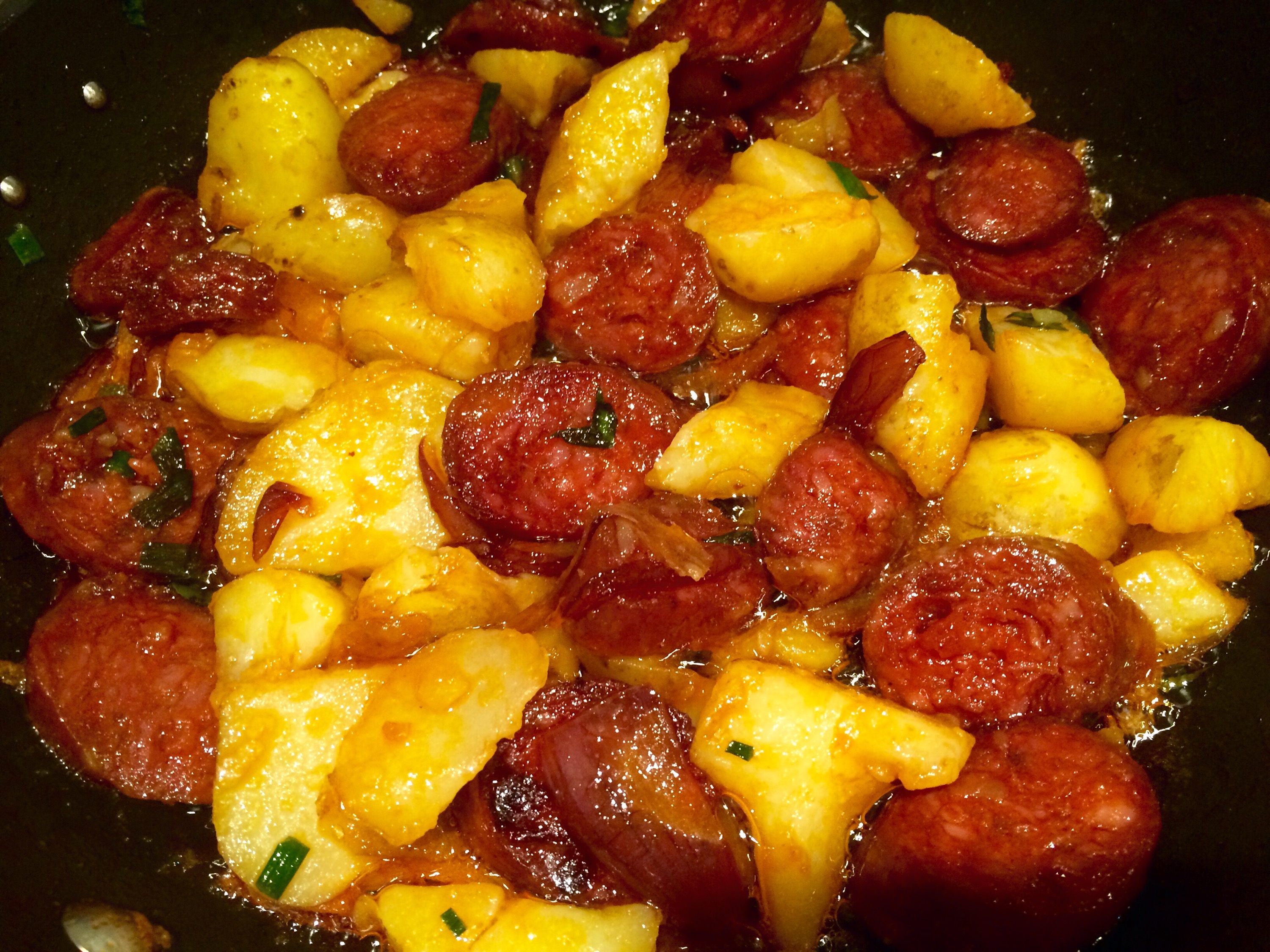 Frying the Leon chorizo off with some sliced organic Dutch red onion..