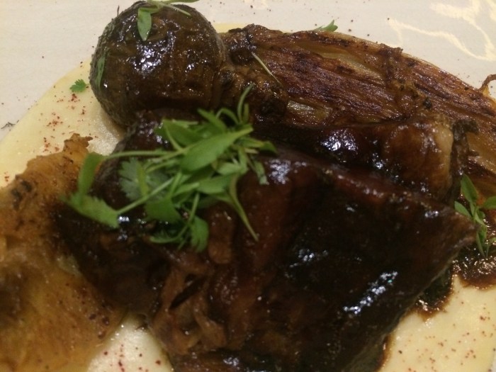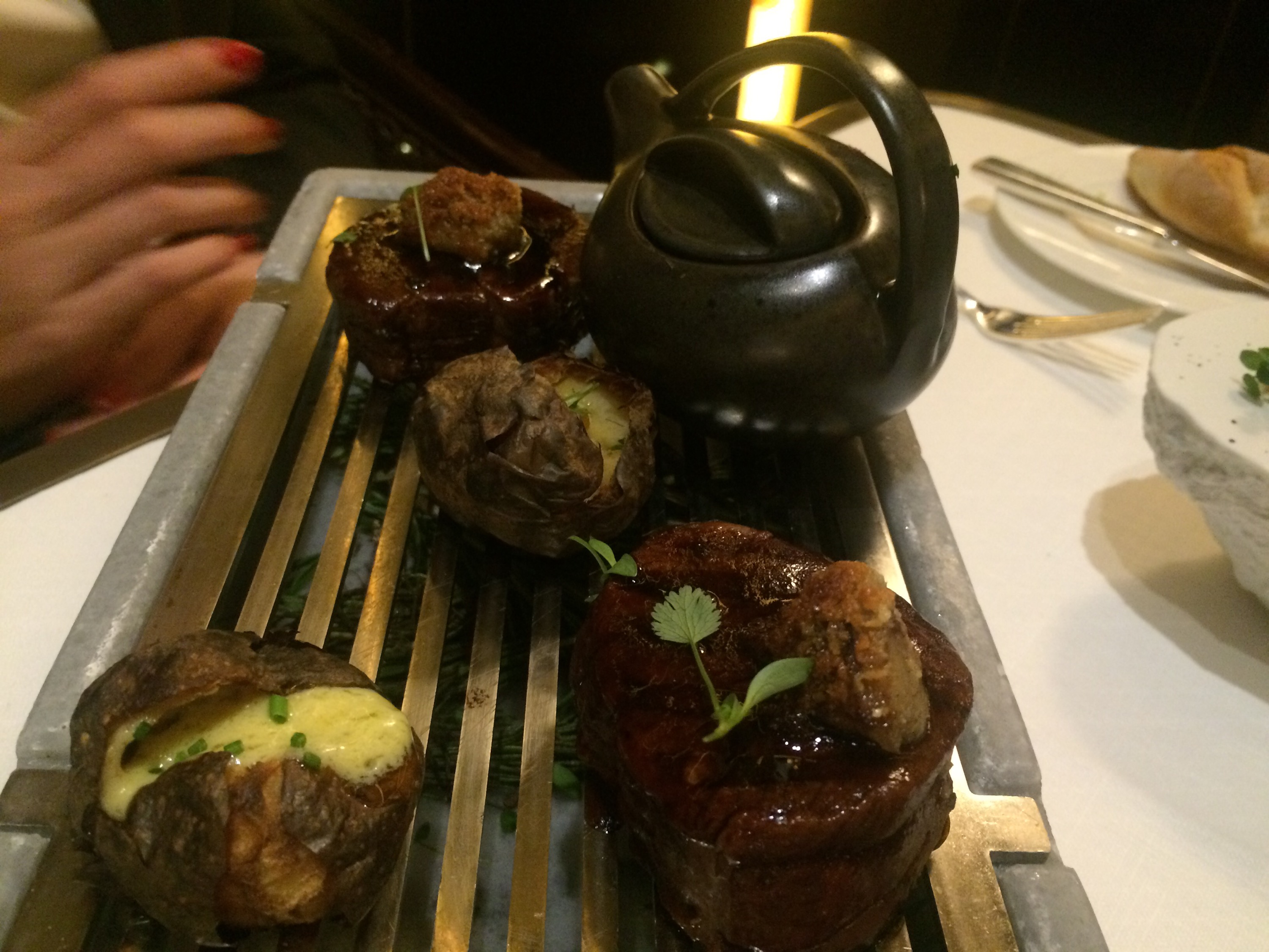Beef tenderloin , crispy marrow and twice baked spuds and jus in a teapot..