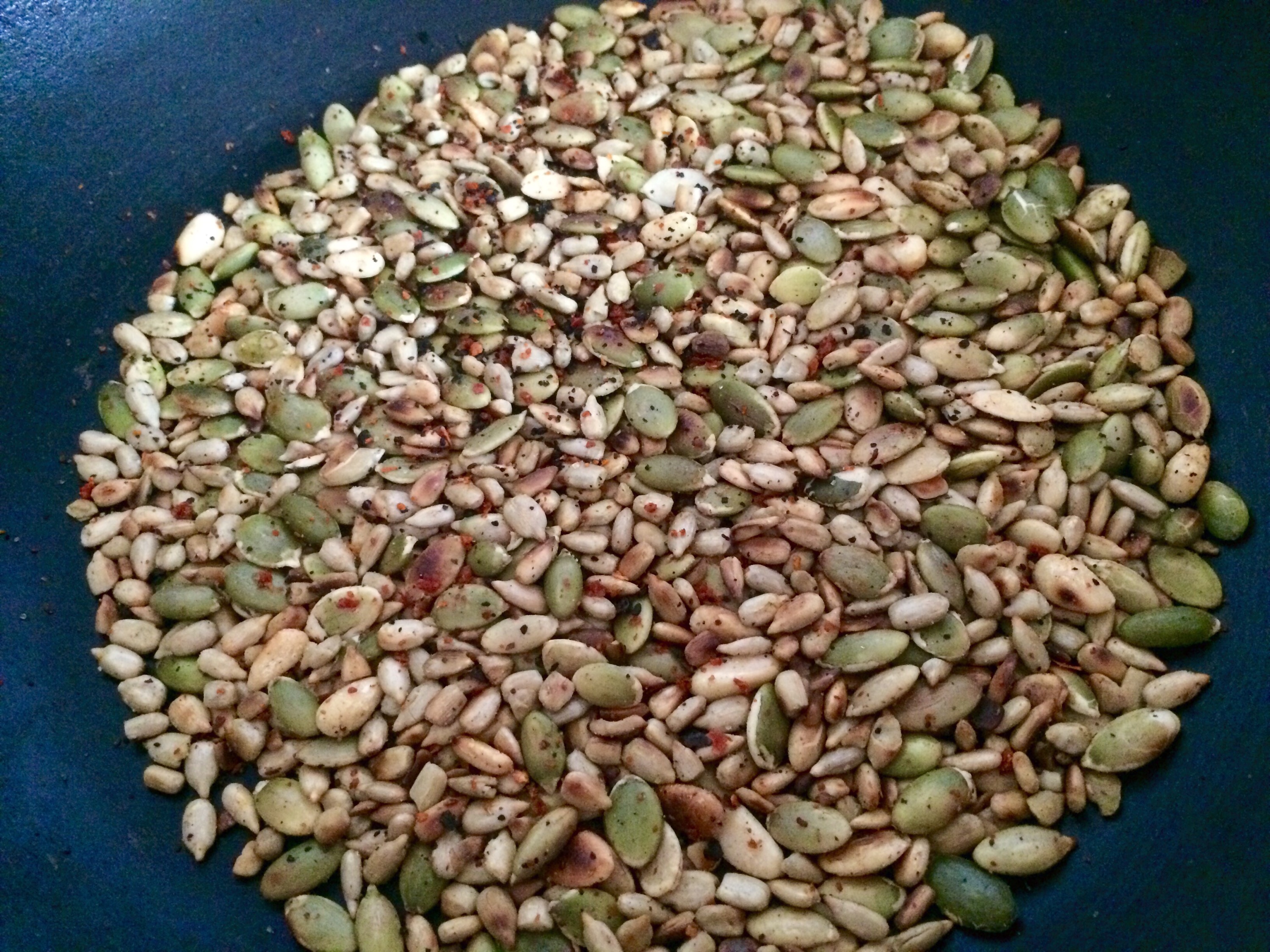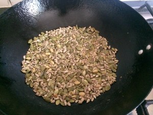 Simply dry fry a mix of sunflower seeds and pumpkin seeds.. (Uncle Bens trusty wok is helping right there.. A proper viceroy..)..