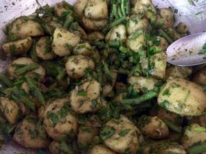 In go the potatoes and the cooked French green beans.. Just use the same water!