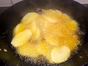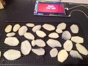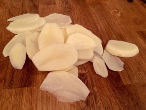 Cut the spuds thin.. I got rid of the mandolin as I decided it was a health hazard.. If you have one then go for one eighth if poss..