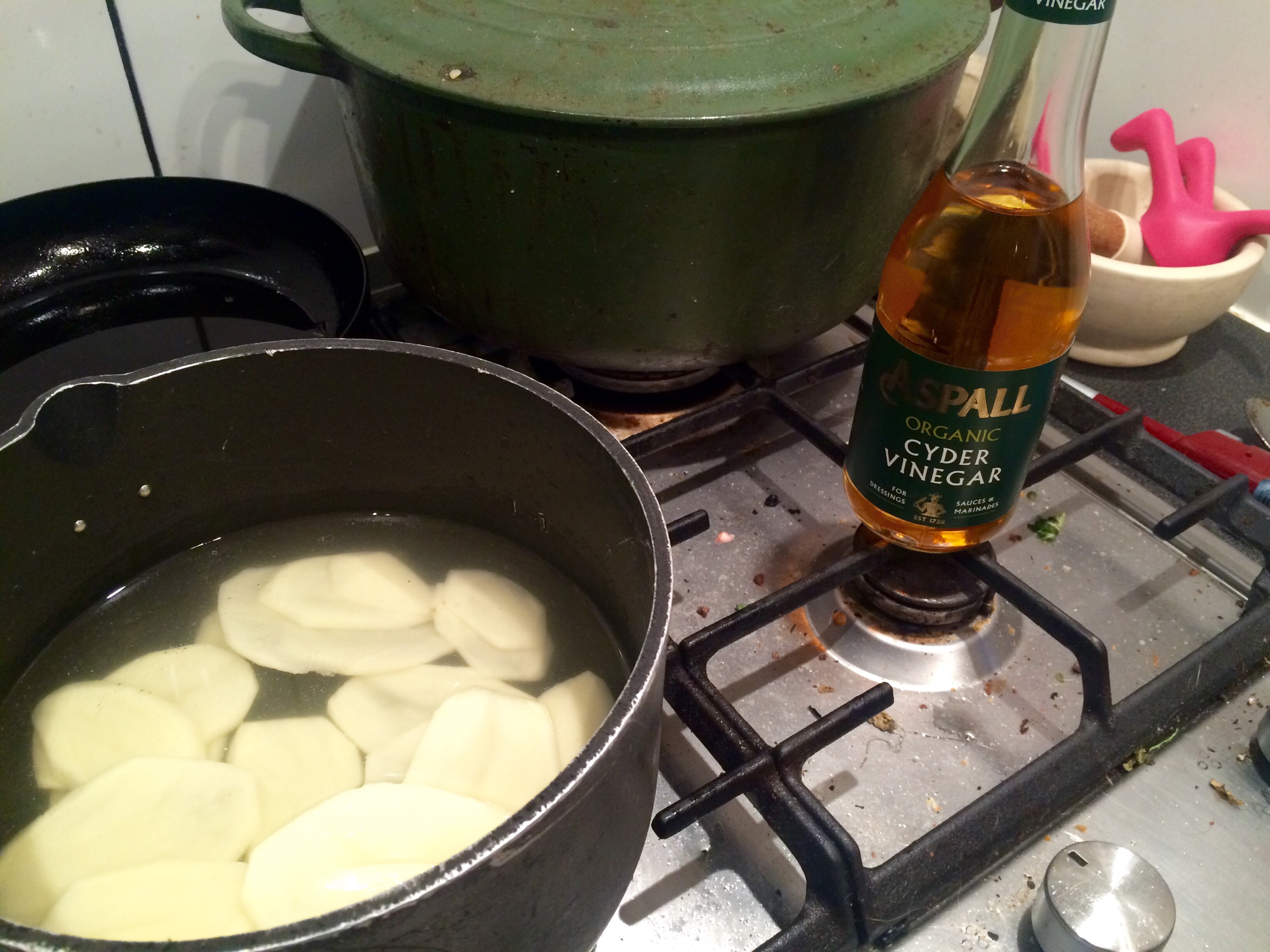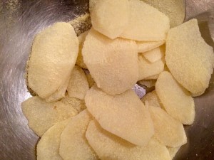 Cut the spuds thin.. I got rid of the mandolin as I decided it was a health hazard.. If you have one then go for one eighth if poss..