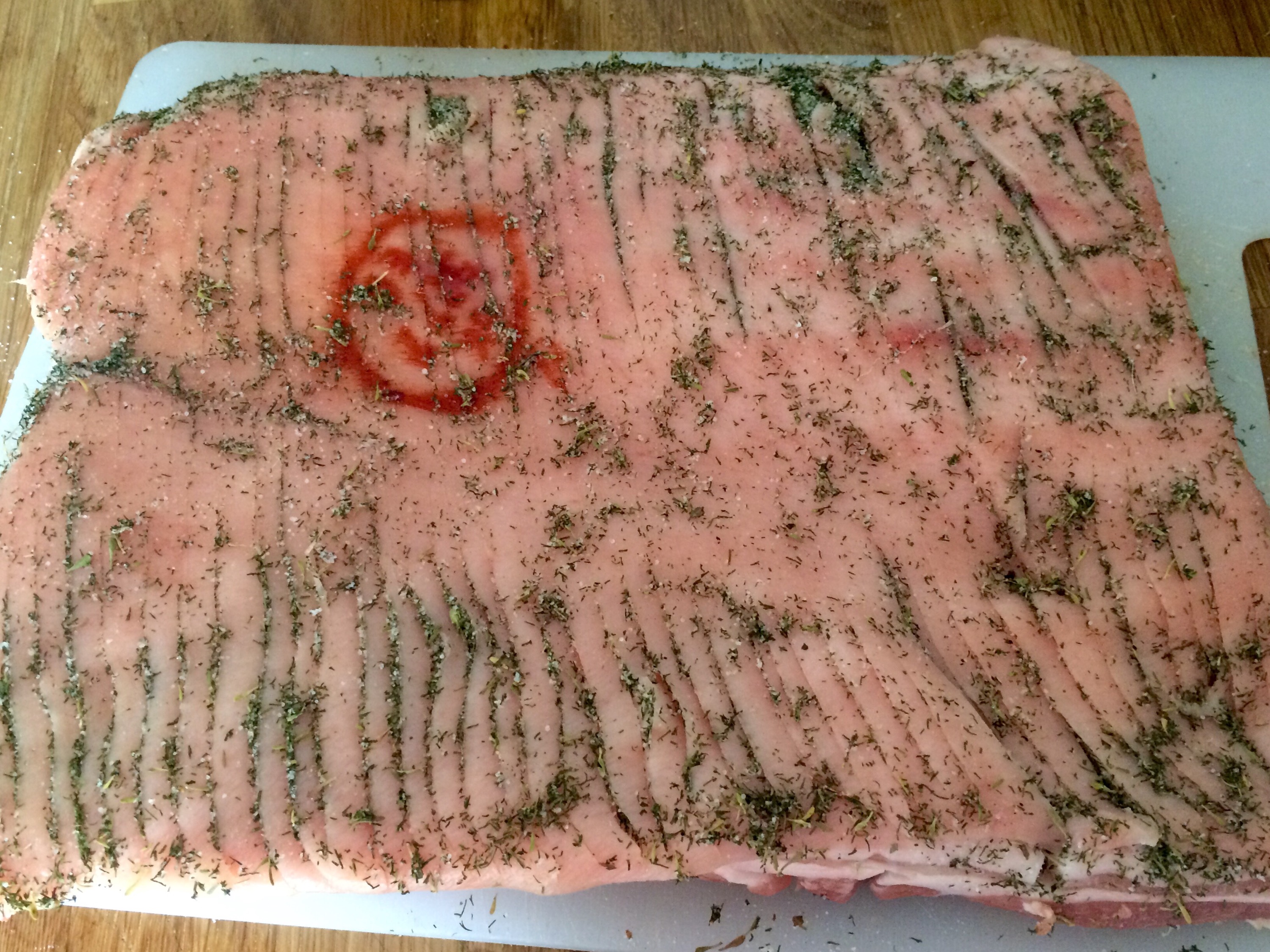 Flipped and dill and salt on the skin for super crackly crackling (the crunch)..
