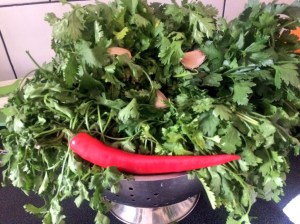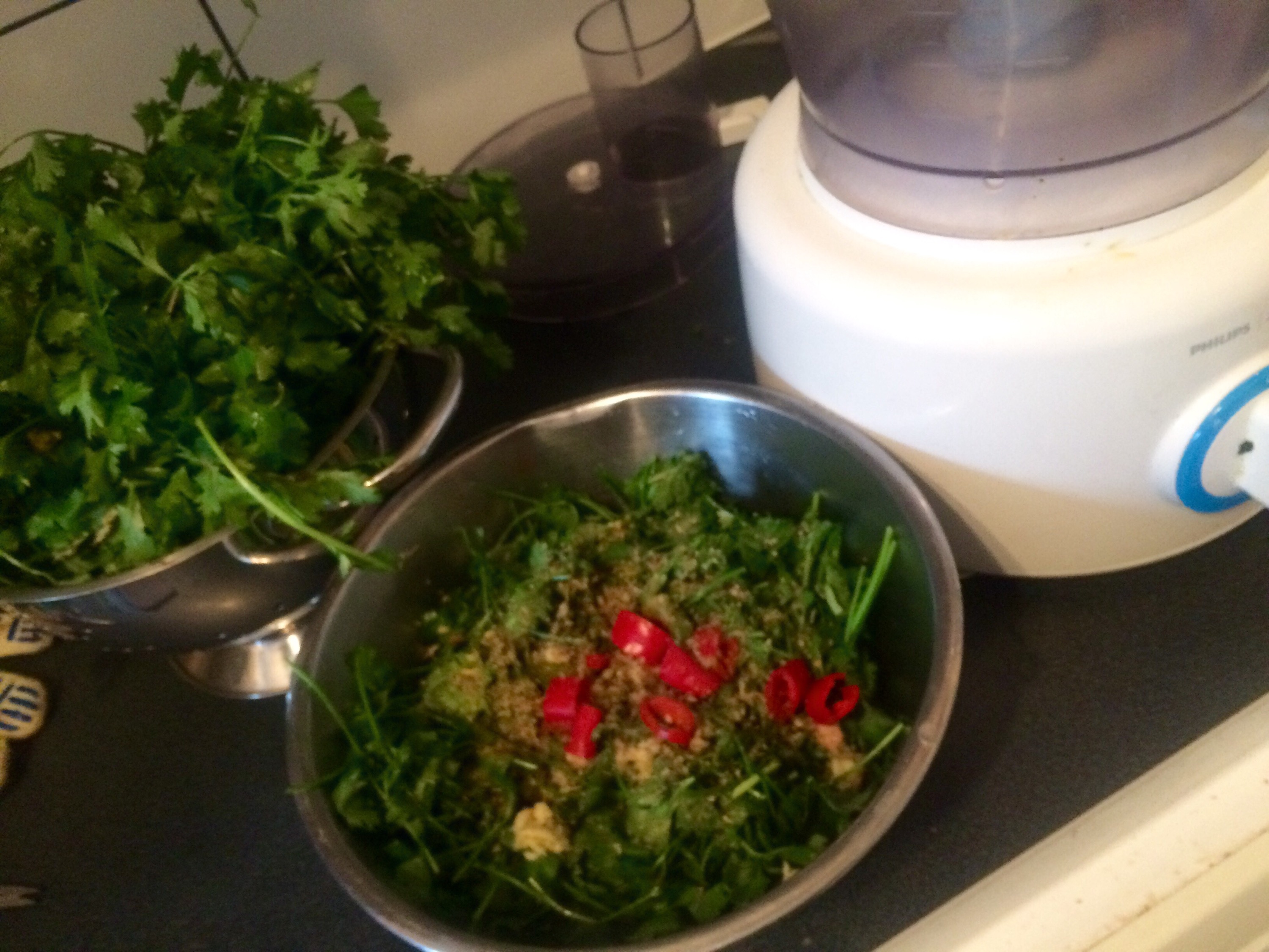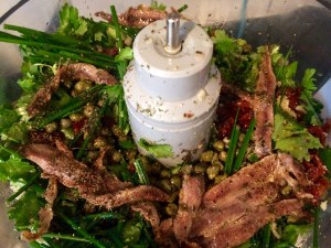 With the rest of the coriander.. Anchovies, capers, wild chives, and sundried tomatoes.. A few seasonings also..