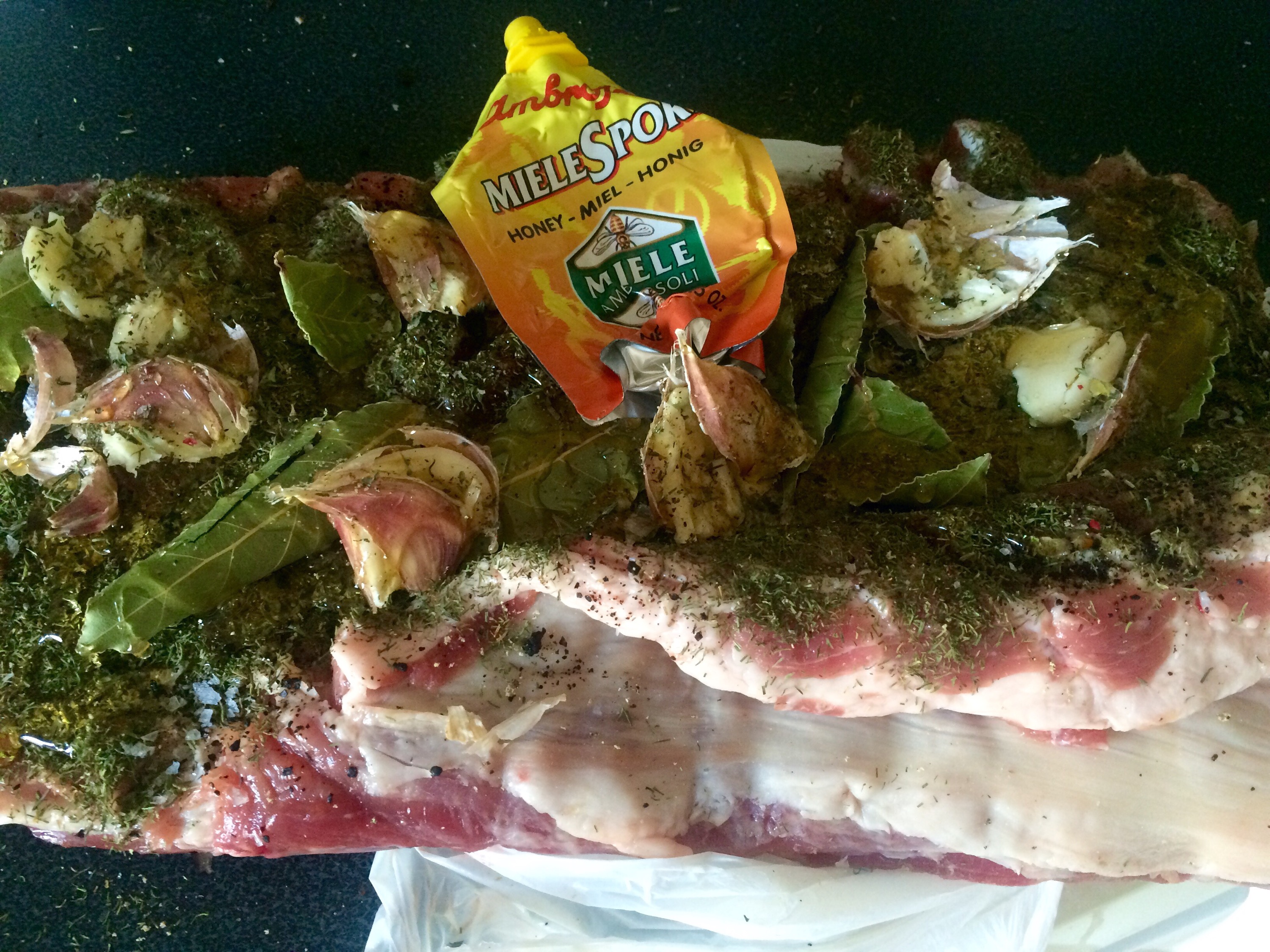 Got the belly. Added dill, bay from my grandfathers tree, French garlic from Ronny squished , Mexican oregano from my Attorney, Italian honey from my pal Wally, and lemon juice and thyme.. From umm the store!