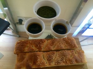 Some Turkish bread toasted and dipped into velvet balsamic and Mrs middletins straight up oil while we take drinks ..