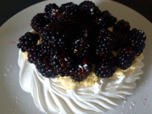 A jersey cream pavlova with blackberries that Mrs Fitz made..