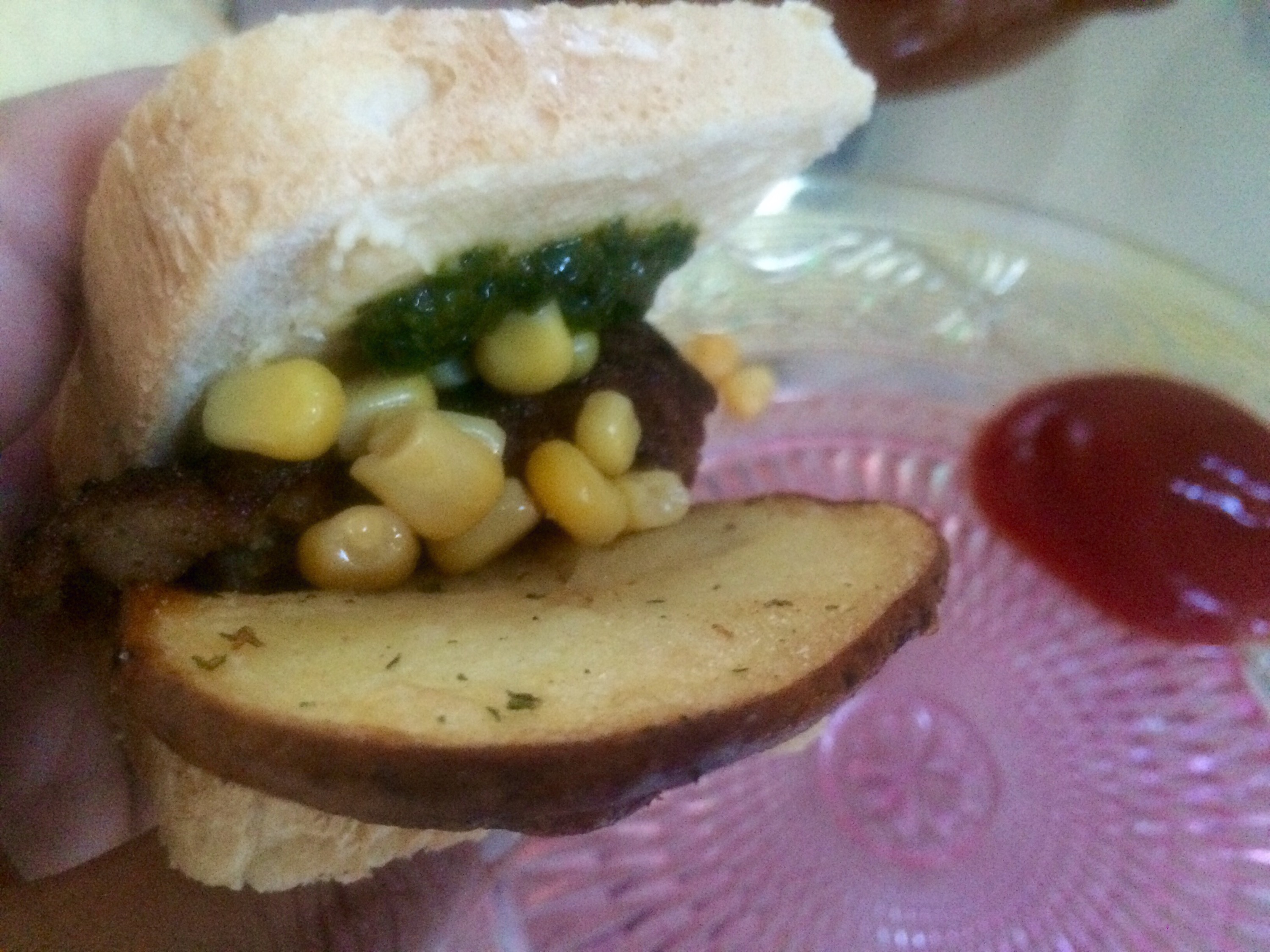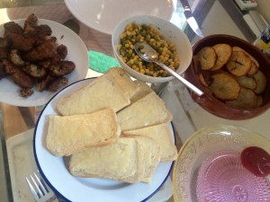 With a token veg of canned peas and corn in butter.. With sliced buttered bread..