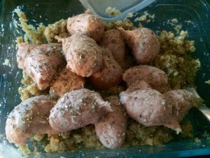 Skinned out some excellent sausages.. (Much better if you make your own.. Ahem!.. ) otherwise good honest store bought ones will be fine.. Make up the sage and onion stuffing mix as per the packet.. Grate two thirds of a fresh apple into the mix.. Add some herbage.. And some white pepper.. Mix it up like grandmaster flash..