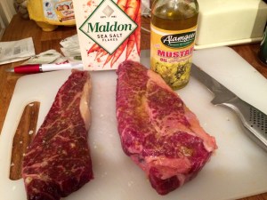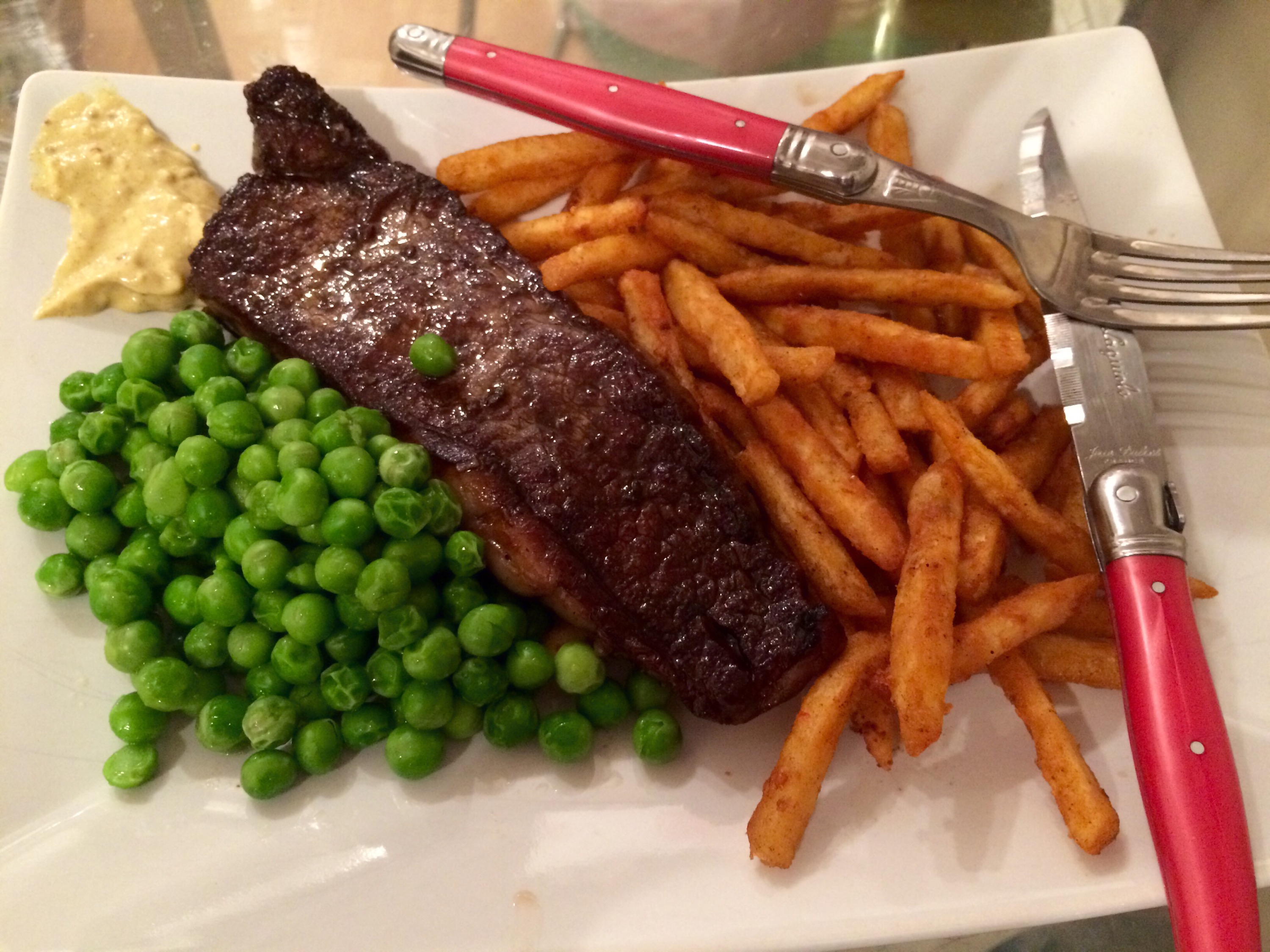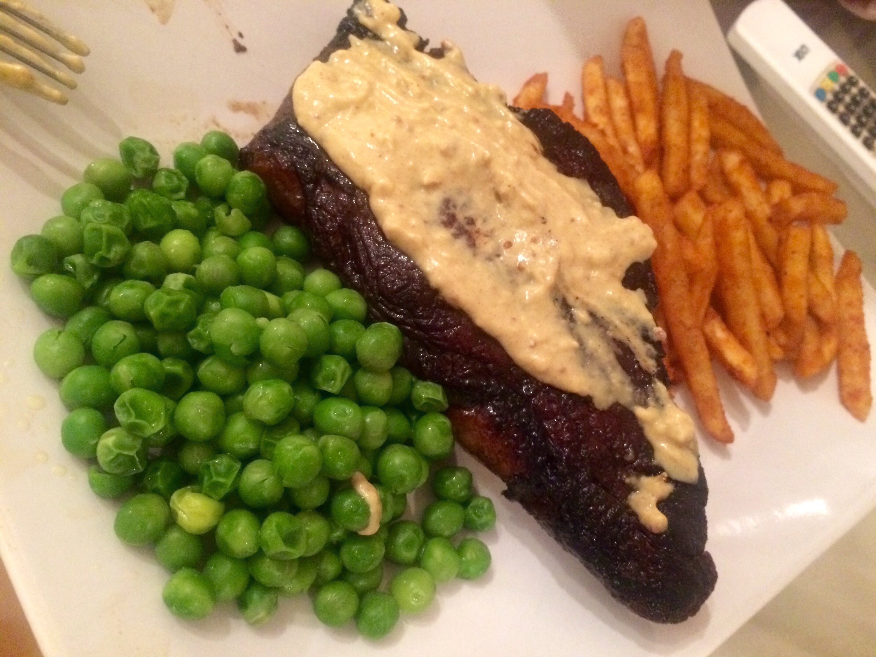 Mustard oil and Maldon salt Sirloin steak,buttered  peas, and Piri Piri fries