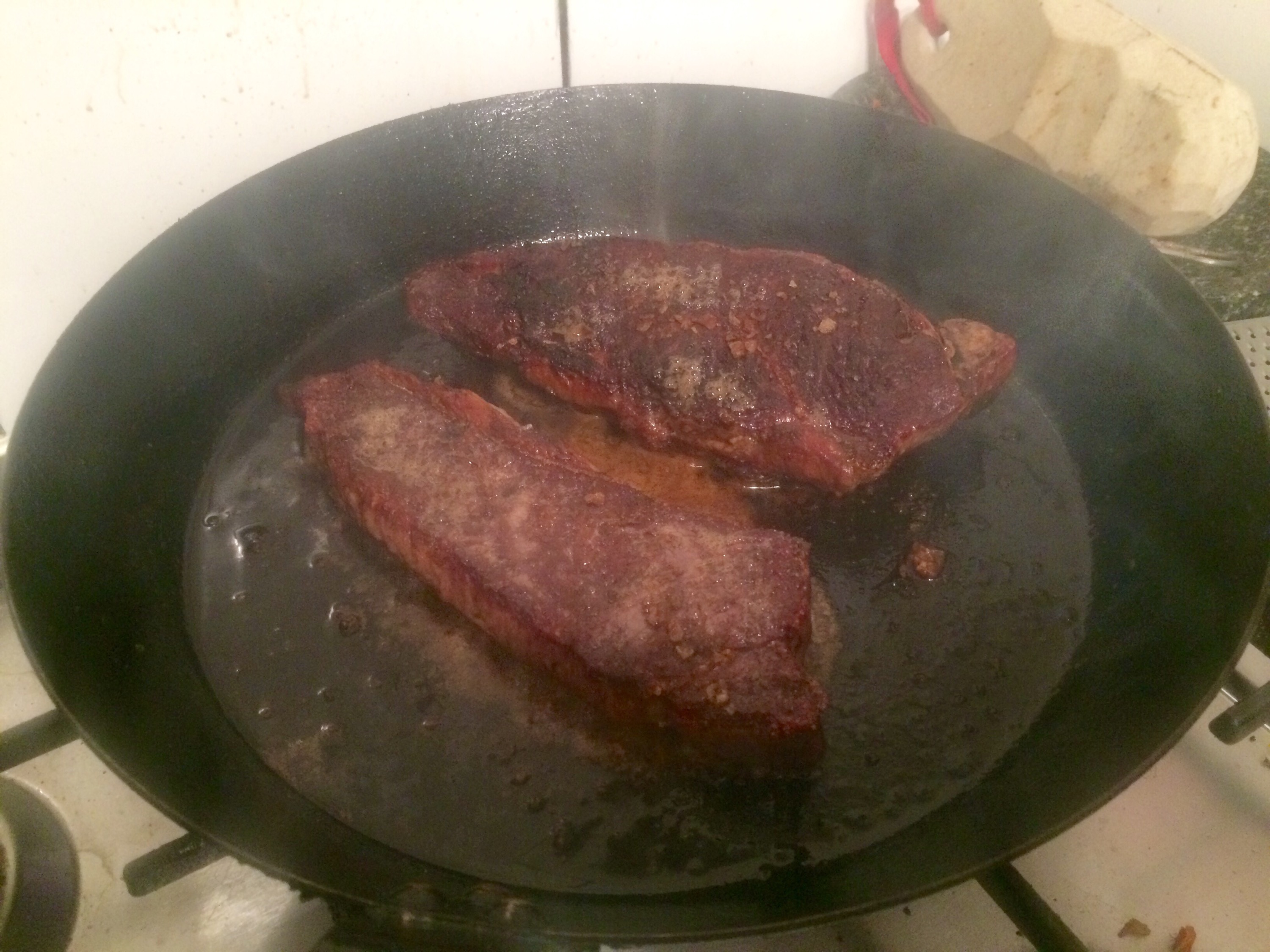 Cooked in the iron pan real hot.. Like fill the kitchen with smoke despite having both sets of doors open hot..