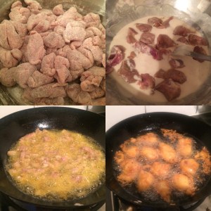 Strips of neck fillet.. Dusted in tempura flour .. Not a batter.. Fried off them the sweet, sour and damn tasty sauce added.. (Thanks uncle Ben!).. Ahem 😏