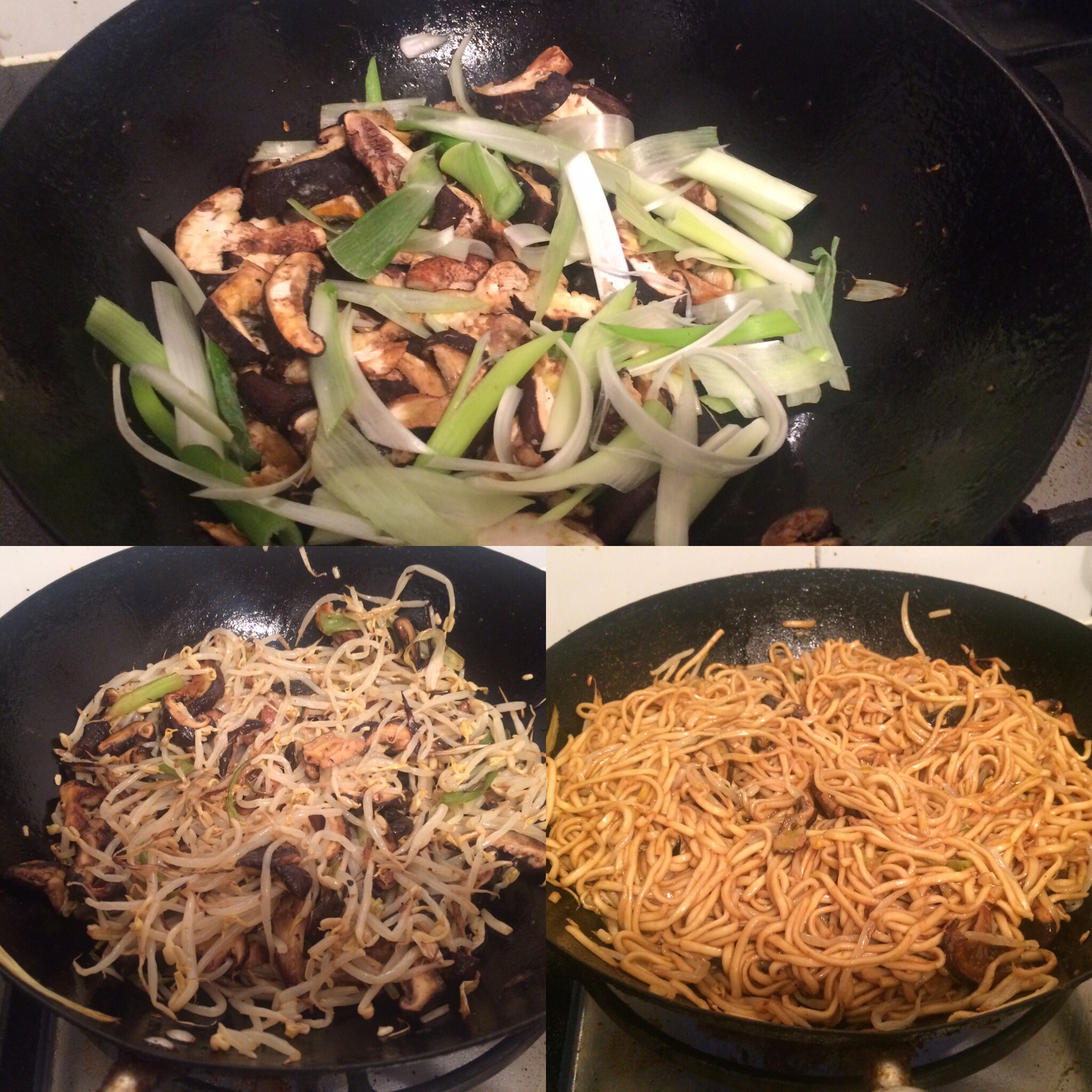 Fresh shiitakes sizzled off with ginger and garlic paste, a can of drained bean sprouts , strips of green onions and rehydrated egg noodles.. Japanese soy sauce and sesame oil for flavour ..
