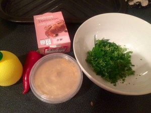 Taking a pot of red ticket crab pate.. Yup crab pate.. A chilli and some garden Greek basil, lemon juice and parsley..