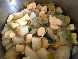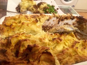 A mashy topping made by boiling up potatoes , swede and leeks..