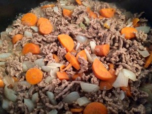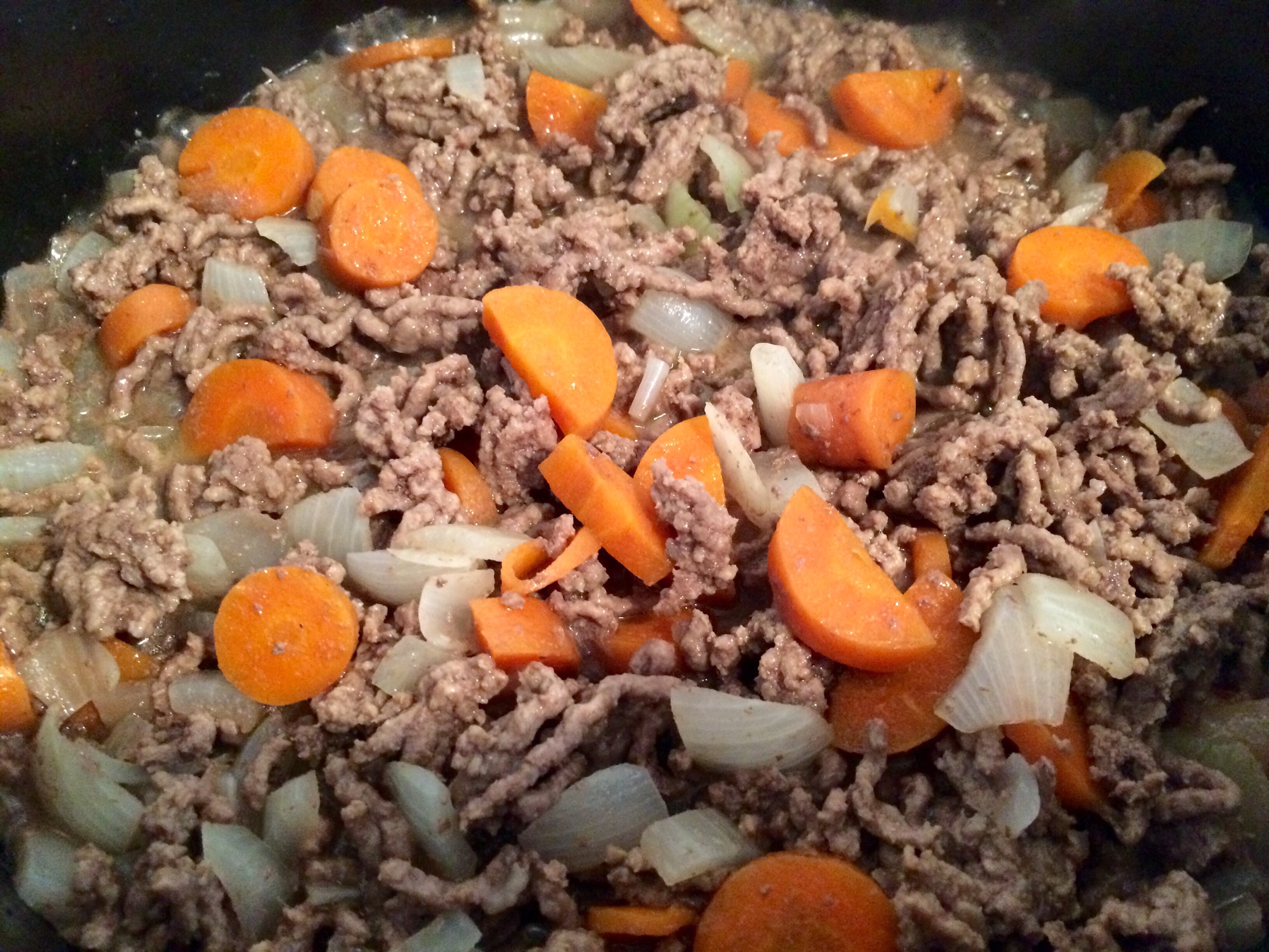 First off browning good ground meat.. Beef of course as it is cottage and not shepherds pie after all! With carrots and onions..