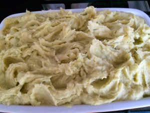 A mashy topping made by boiling up potatoes , swede and leeks..