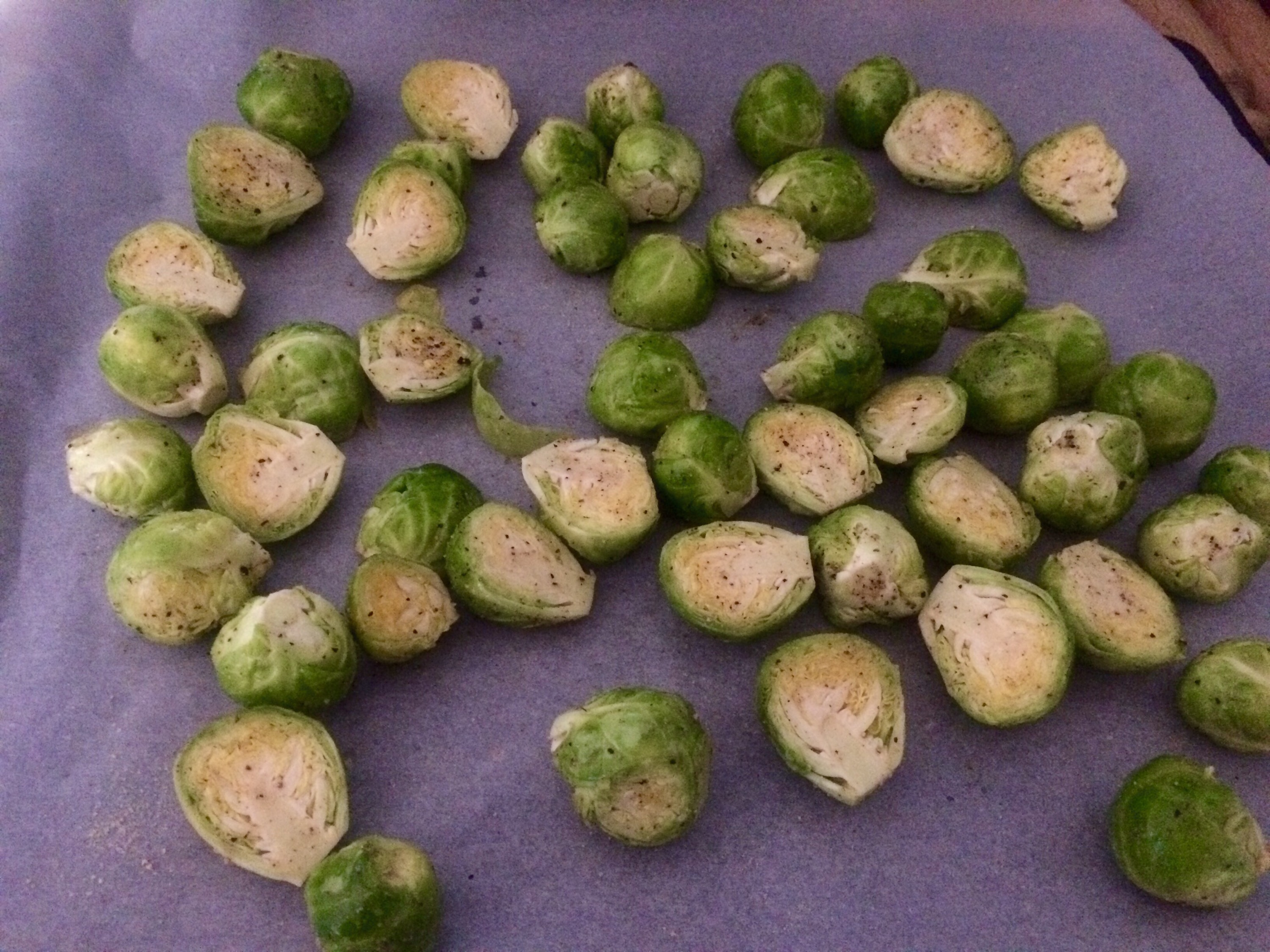 The Brussels are peeled and topped or is that bottomed? And simply tossed with a tincy wincy amount of organic Greek olive oil… Bristol blend pepper and vegemare salt.. So simple yet once cooked these have this amazing flavour and textures..