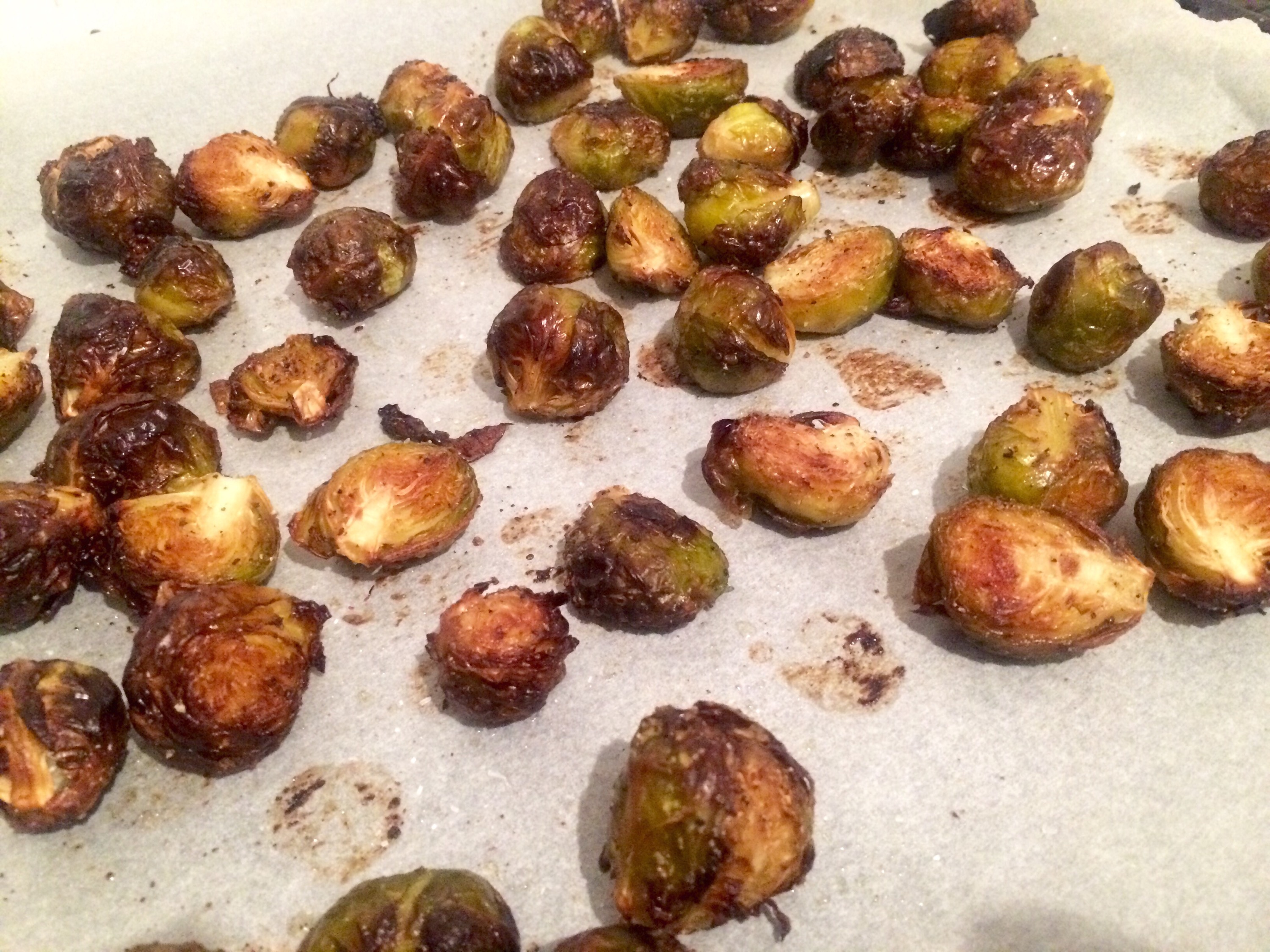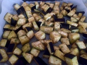 They both go happyly into a hottish oven turning them once.. You want the aubergine to get really sost and the Brussels slightly burnt..