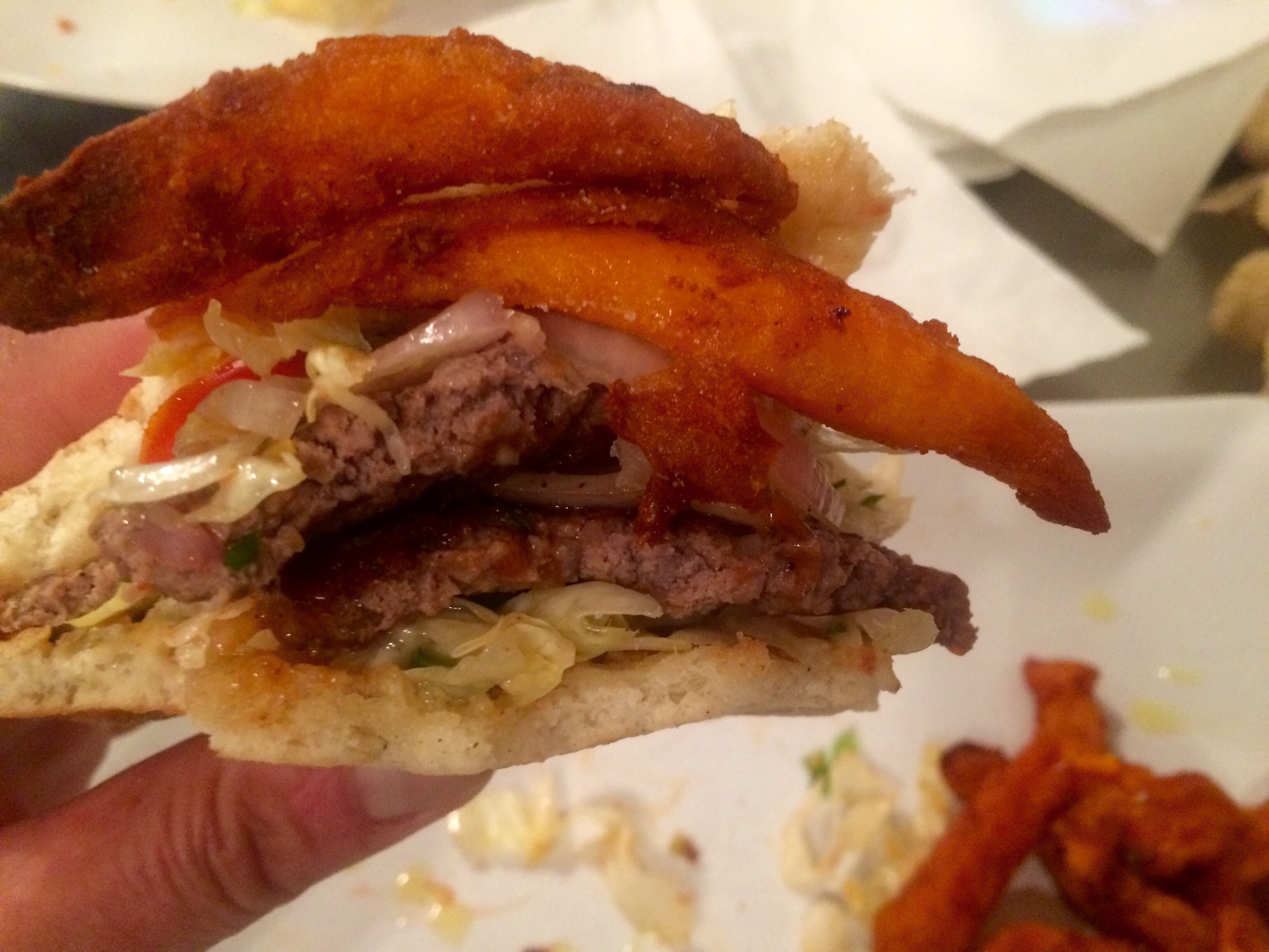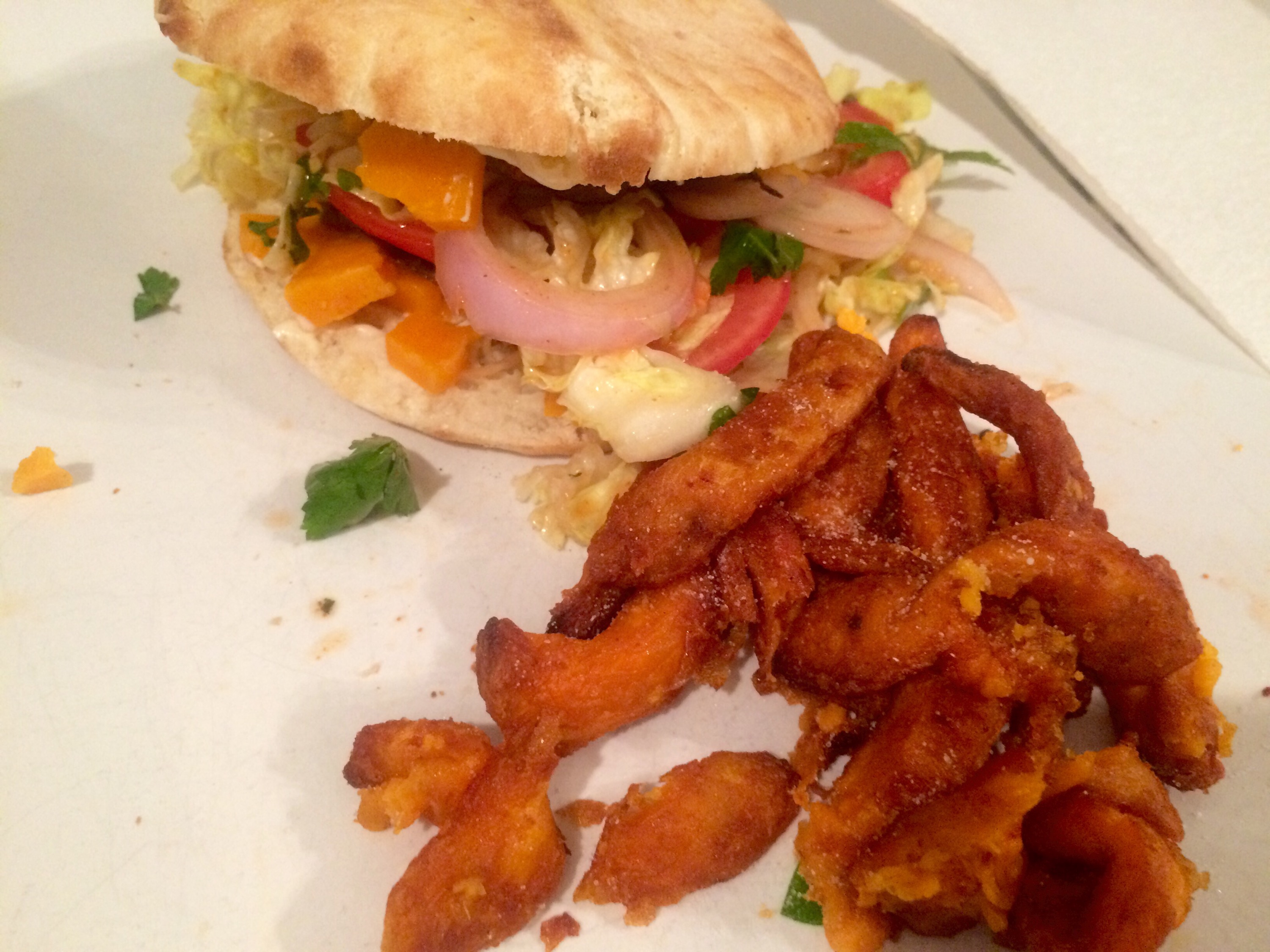 The sweet potatoe fries simply foraged from the depths of the deep freezer.. And cooked in the top oven with a shake a shake shake of malt vinegar..