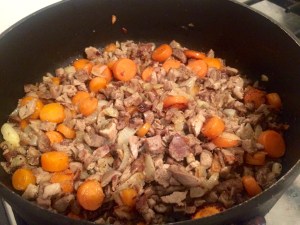 The leftover lamb leg.. Chopped and added to the pan.. This is a good opportunity to check through for ‘grizzly’ bits.. Although gotta say with this great welsh lamb there really ain’t much to go on..
