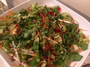 A salad of crunchy iceberg, green onion, baby plum tomato and shredded carrot and torn fresh coriander, with thick balsamic and a sprinkle of olive oil..