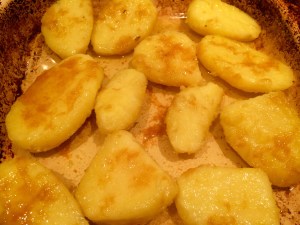 Inca bella potatoes peeled and parboiled.. The oil juices from the pork spooned on top..