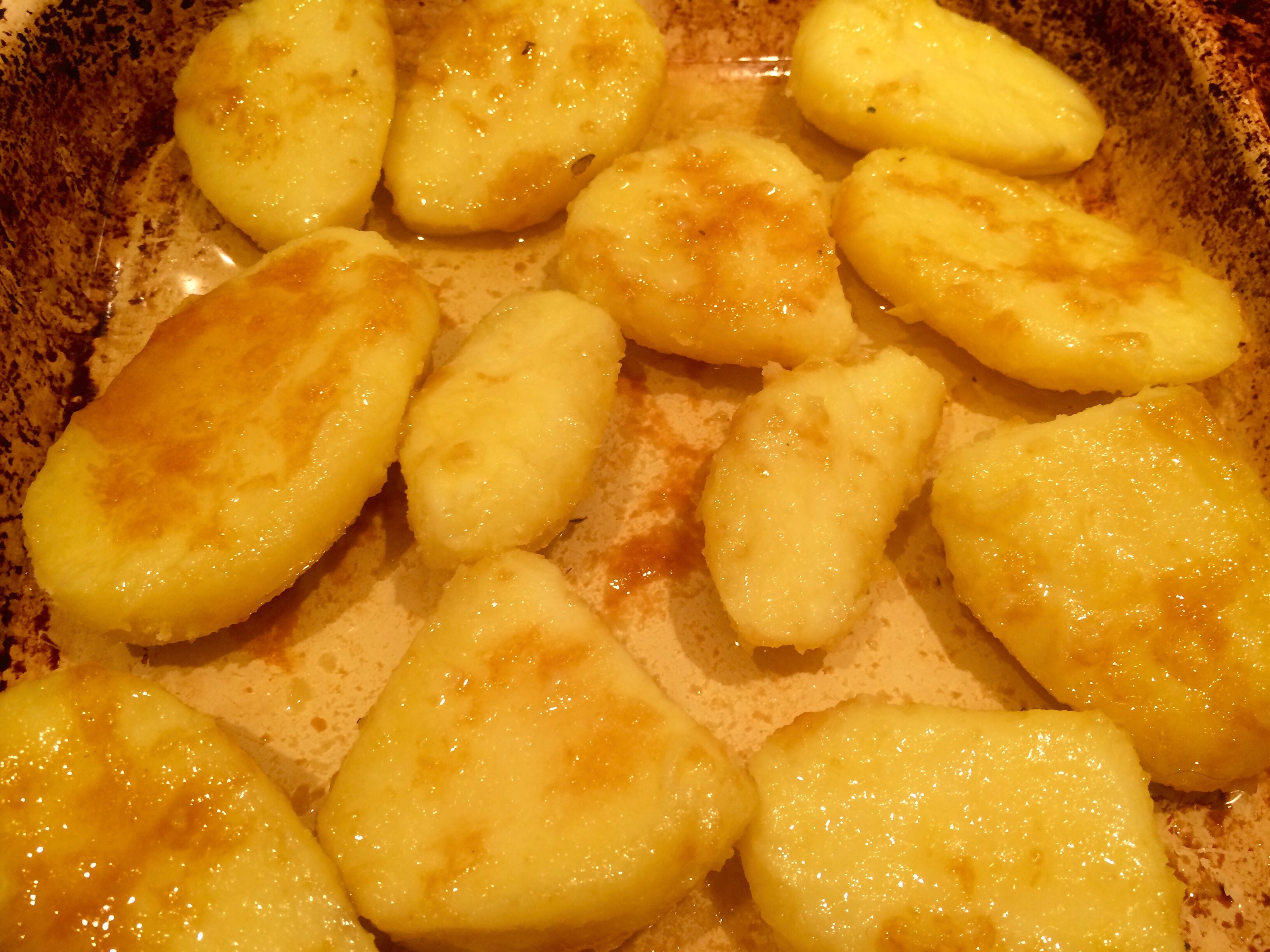 Inca bella potatoes peeled and parboiled.. The oil juices from the pork spooned on top..