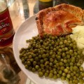 Steak pie , Greek? mash and peas..