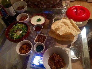 Into a dough. Rested a little while .. In that time decanting coriander sauce, mint sauce, Punjabi pickle, natural yoghurt with lemon and salt.. Frying off some popadoms.. Chopping salad..